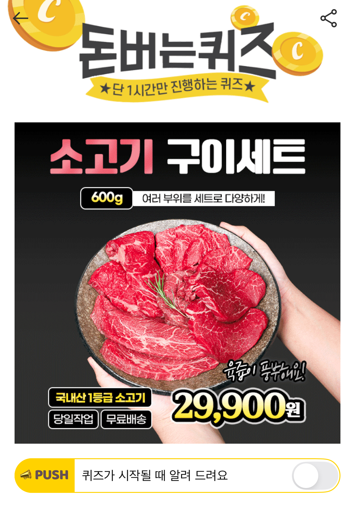 캐시워크 돈버는퀴즈 정답 캐시딜 타임특가 국내산 소고기 구이세트 1등급 국내산 소고기 구이세트 600g