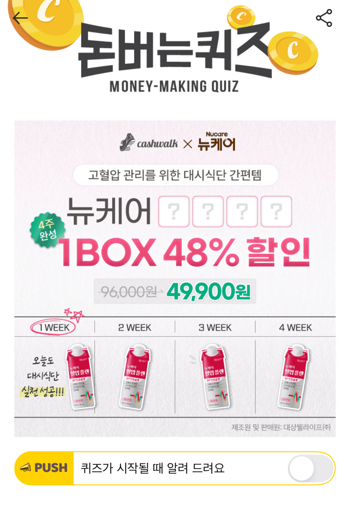 언제 어디서든 대시식단 실천이 가능한 뉴케어 0000. 4주 동안 꾸준히 간편하게 관리할 수 있도록 기간한정 1BOX 48% 특가로 제공됩니다. (힌트:ㅎㅇㅍㄹ)