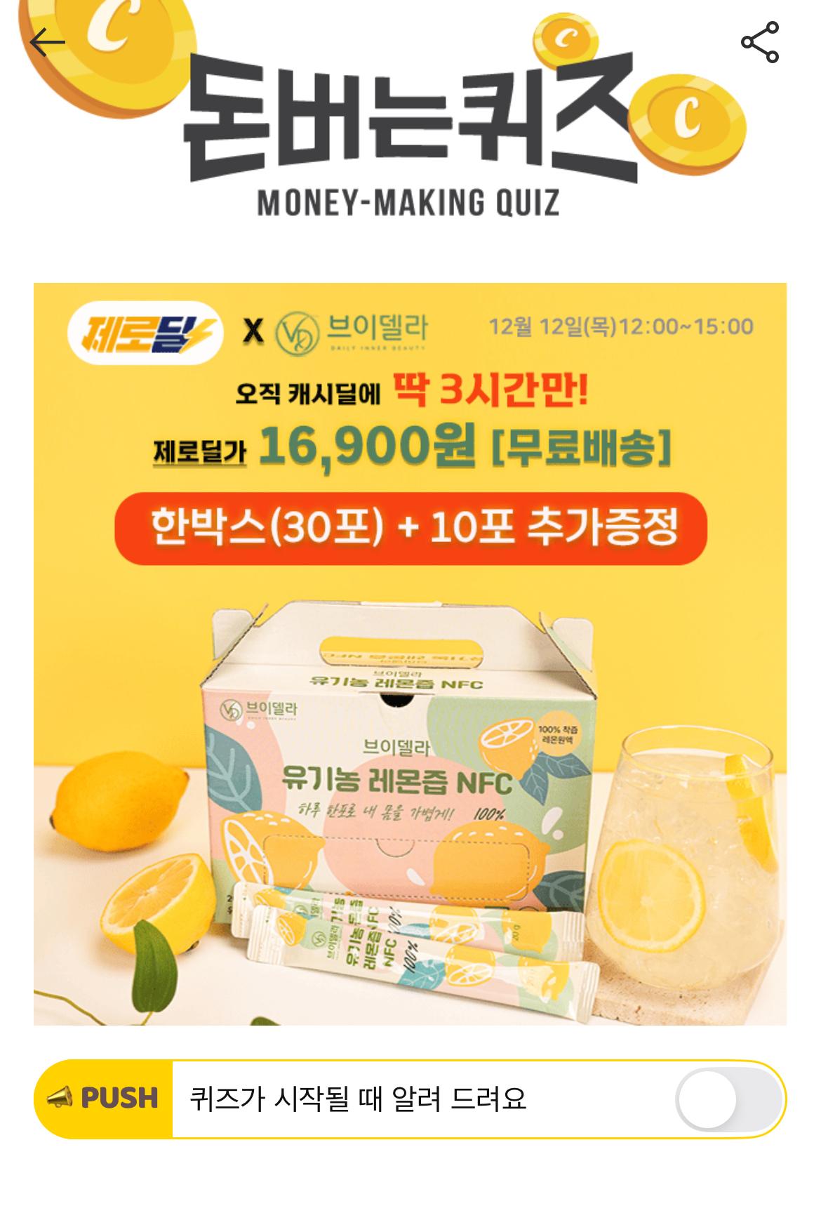 캐시워크 돈버는퀴즈 정답 제로딜 브이델라 유기농레몬즙 영어