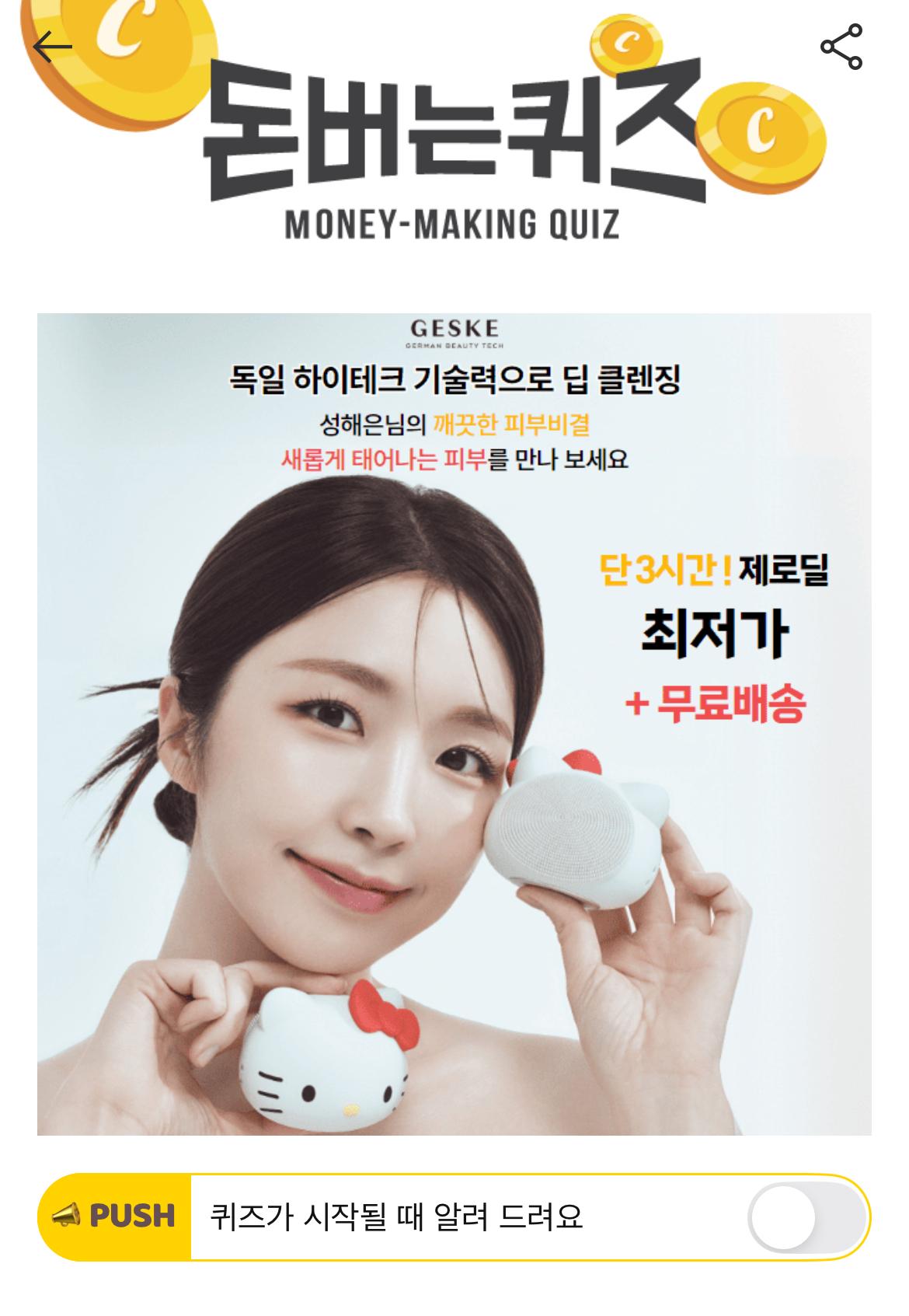 단 3시간 동안 진행되는 "캐시딜" 타임특가에서 독일 OOOO 기술력으로 새로 태어나는 딥클렌징 GESKE를 역대급 할인으로 최저가로 진행됩니다. GESKE는 헬로키티와의 콜라보로 사랑스러운 포켓형 디자인과 촘촘하고 미세한 실리콘 브러시로 성해은님의 깨끗한 피부비결로 알려져있습니다. 빈칸에 들어갈 글자는 무엇일까요?