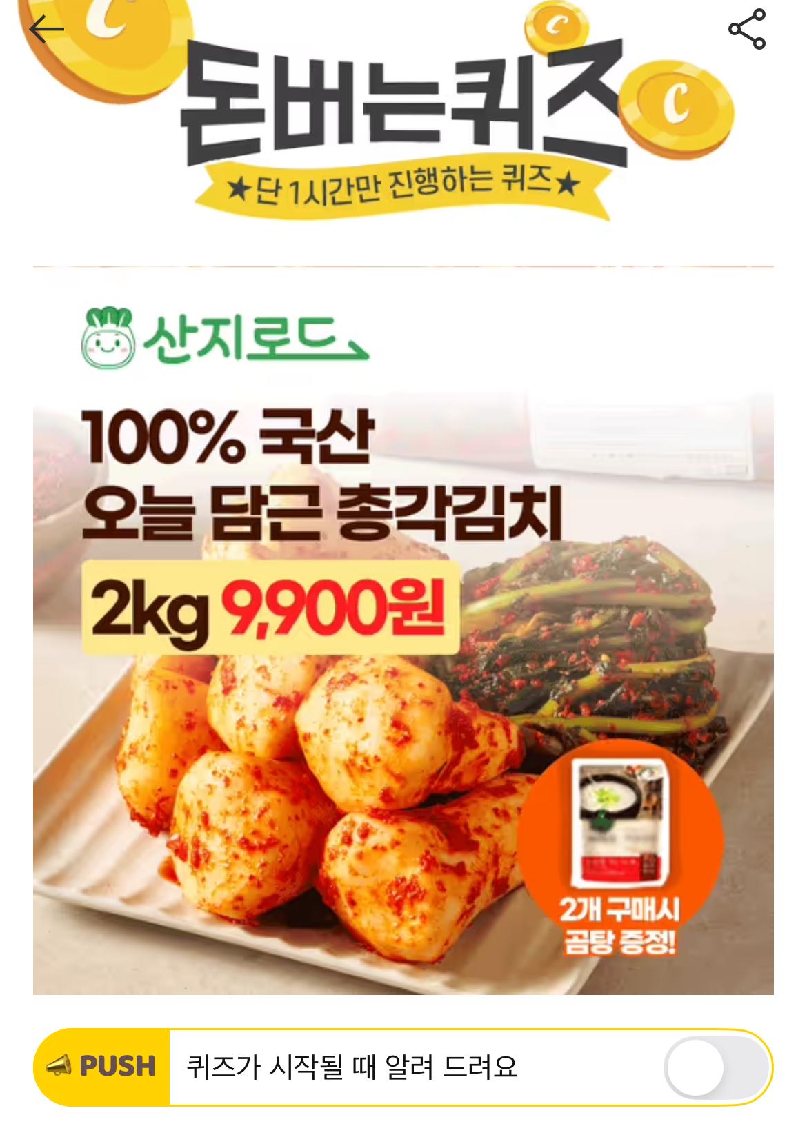 캐시워크 돈버는퀴즈 정답 산지로드 총각김치
