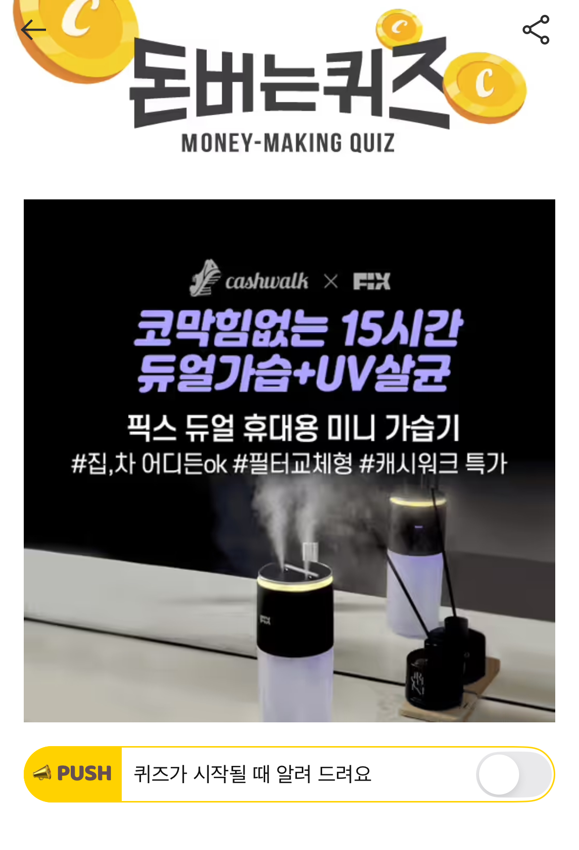 캐시워크 돈버는퀴즈 정답 픽스 듀얼 휴대용 미니 가습기