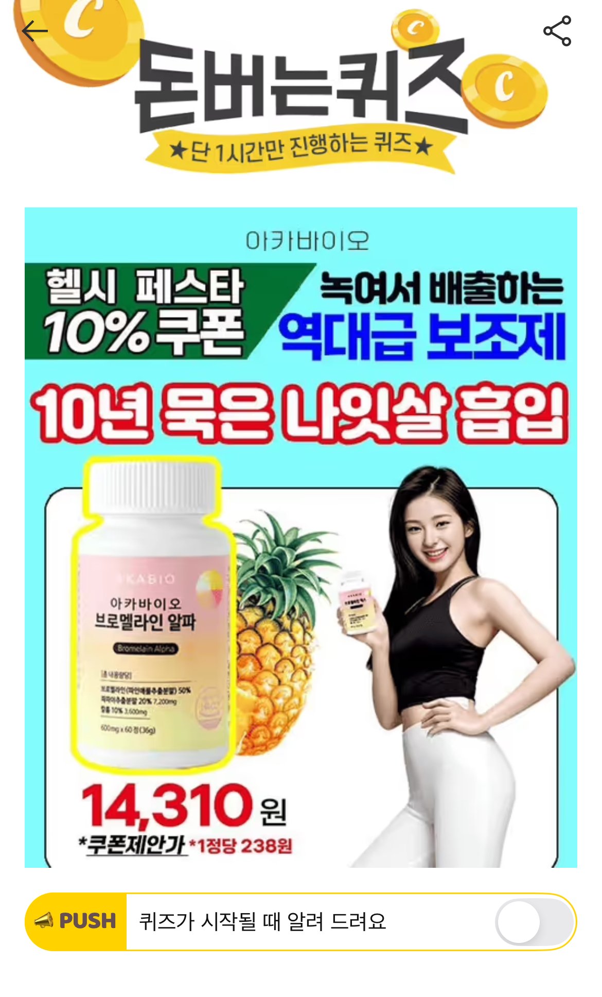 캐시워크 돈버는퀴즈 정답 아키바이오 브로멜라인 알파 60정
