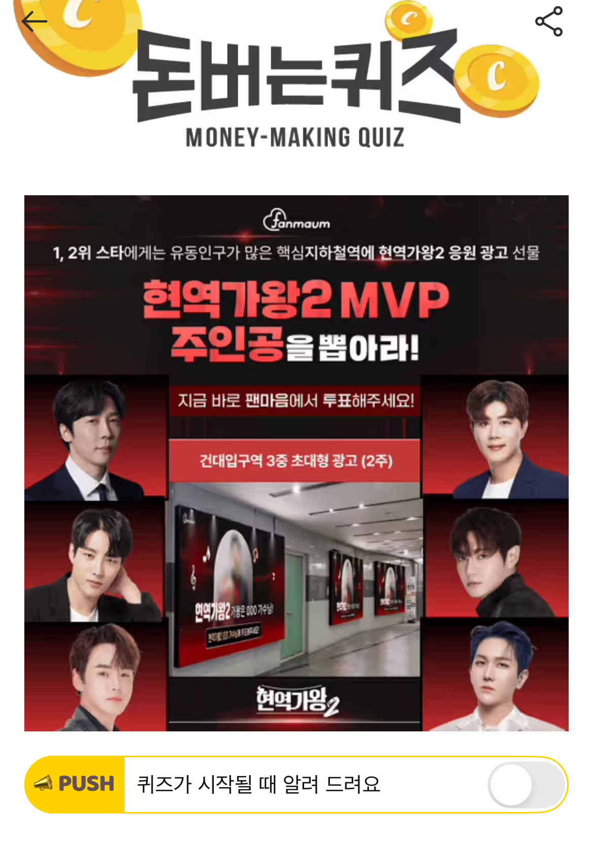 팬마음에서 진행 중인 현역가왕2 OOO 주인공을 뽑는 투표에서는 1, 2위를 달성한 스타에게 현역가왕2 투표 응원 문구가 담긴 지하철역 광고를 선물해드려요.