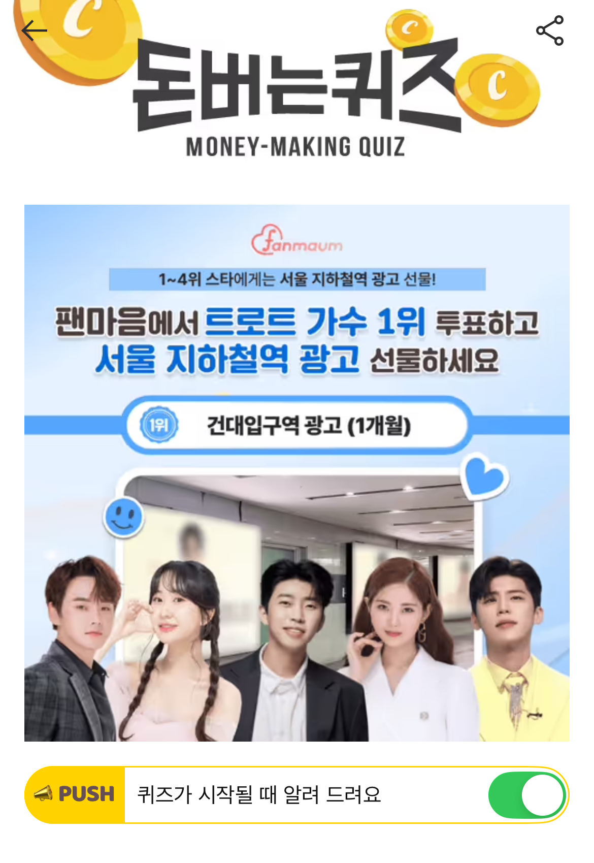 현재 팬마음에서는 OOOOO 남자/여자 투표 33차가 진행 중이에요! 이 투표에서 1-4위를 달성한 남녀 스타에게는 서울 지하철역 광고를 무료로 드려요!