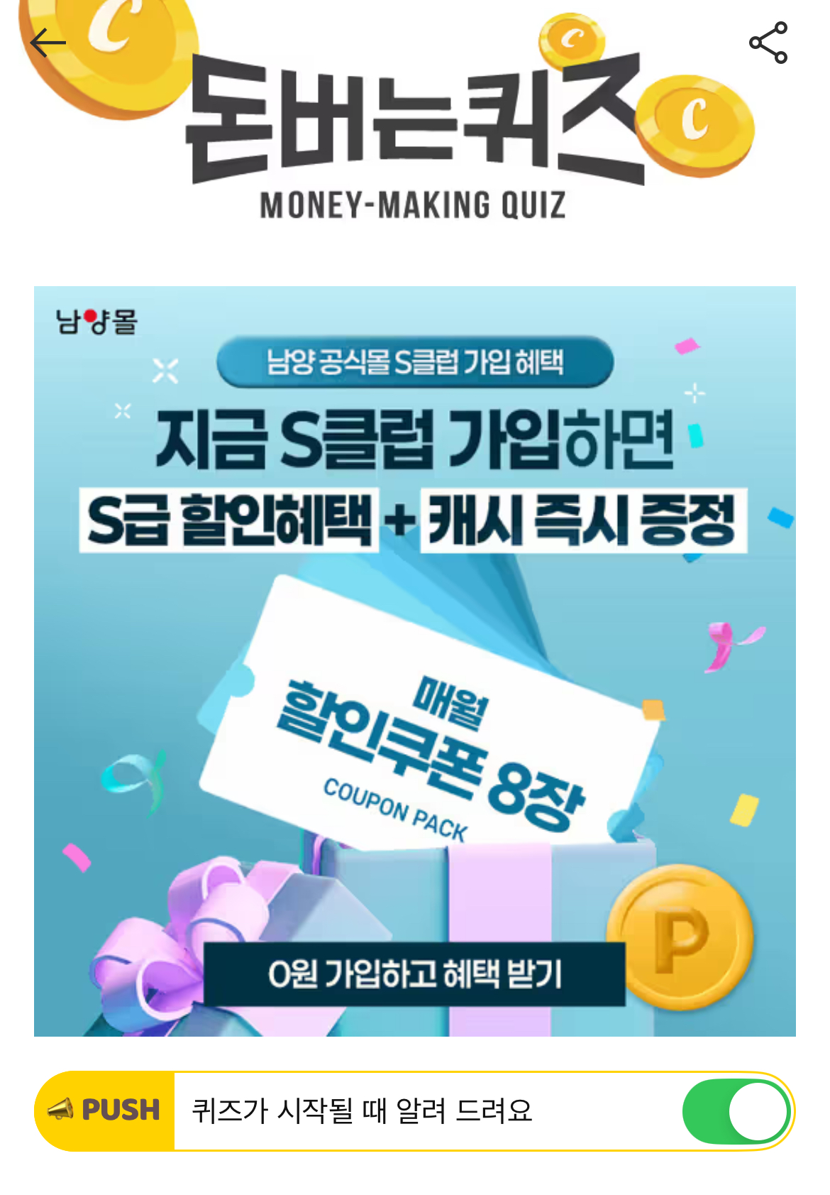 캐시워크 돈버는퀴즈 정답 남양몰 S클럽 멤버십 OOO 등급