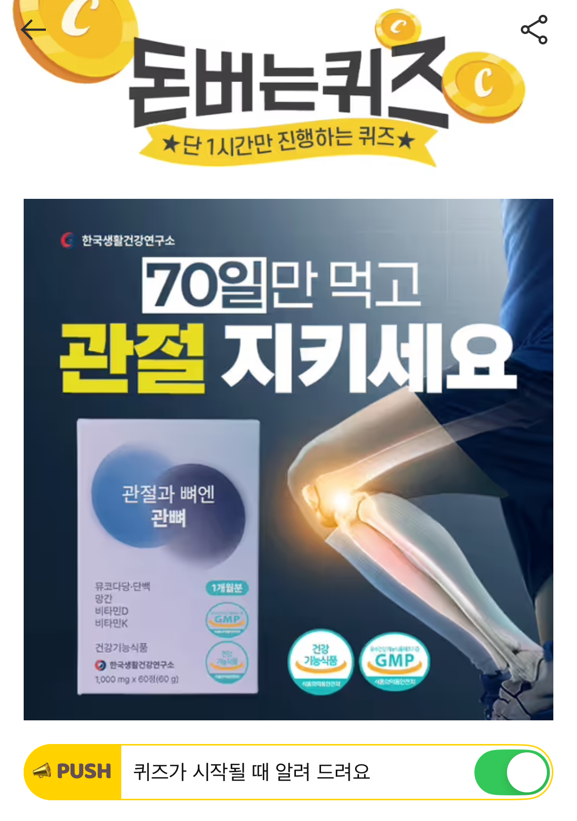 캐시워크 돈버는퀴즈 정답 한국생활건강연구소 관절과 뼈엔 관뼈 OO 관절 통증