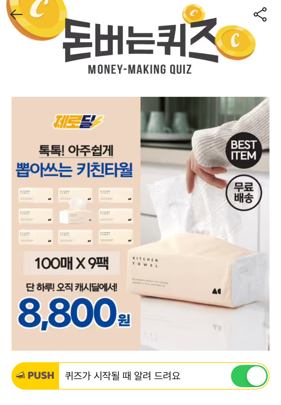 캐시워크 돈버는퀴즈 정답 캐시딜 타임특가 뽑아쓰는 키친타올 OOOO원+무료배송