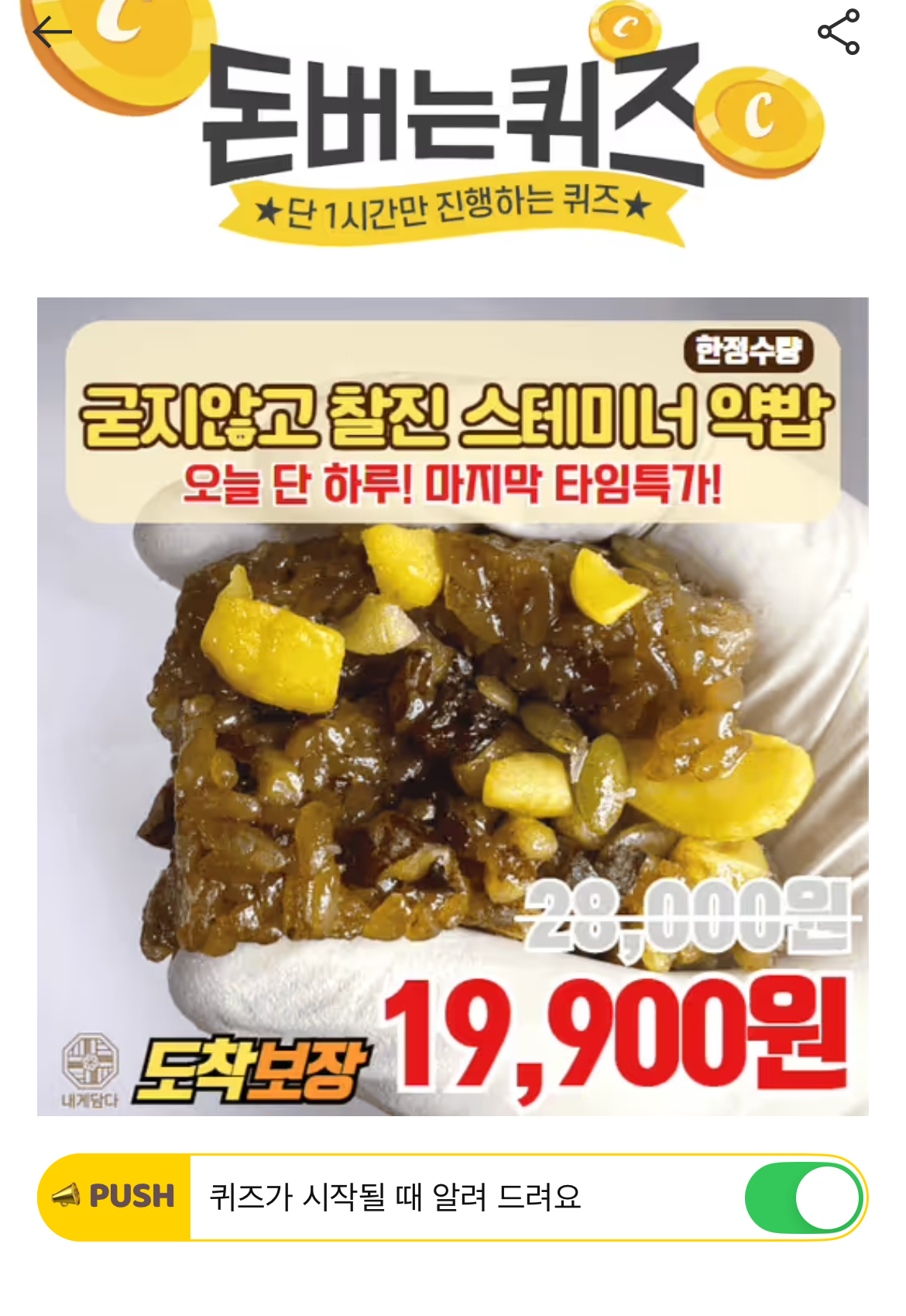 캐시워크 돈버는퀴즈 정답 캐시딜 타임특가 산해직송 해남 꿀밤고구마 2kg 역대급 할인 OOOO원+무료배송 (0) | 2025.01.21 |