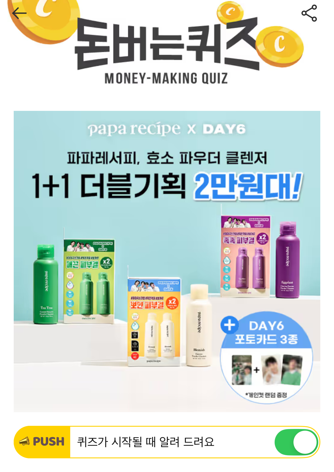 캐시워크 돈버는퀴즈 정답 파파레서피 ㅂㄹㅁㅅ / OOOO 포토카드 영문+숫자