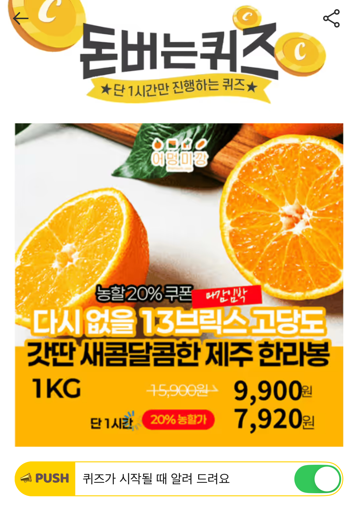 캐시워크 돈버는퀴즈 정답 캐시딜 타임특가 가온한라봉 1kg 농할 20% OOOO원+무료배송