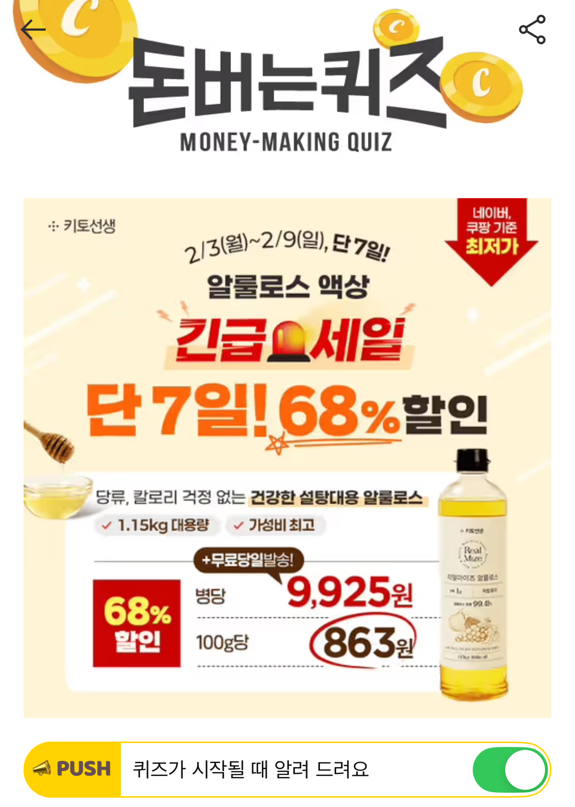 [단 7일! 긴급세일] 1.15kg 대용량 알룰로스 68% 할인! 병당 단돈 9,925원! 네이버, 쿠팡 기준 최저가 100g당 863원! 1.15kg 대용량 & 가성비 최고 알룰로스 특가 찬스 건강한 설탕대용 알룰로스 활용 레시피, 함께 알아볼까요? 커피에 시럽 대신 알룰로스를 넣은 건강하고 OOO OO로 마셔보세요! OOOOO은 무엇일까요?
