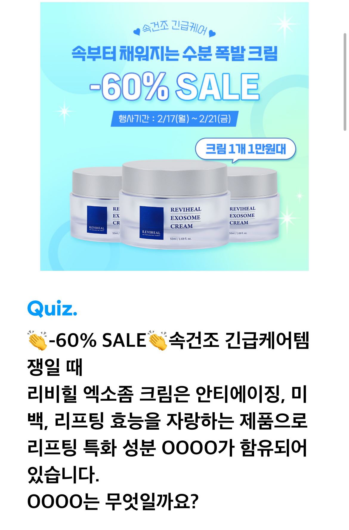 -60% SALE속건조 긴급케어템 쟁일 때 네이버가 선정한 엑소좀 대표 브랜드 리비힐의 엑소좀 크림은 인체지방조직에서 유래한 줄기세포배양액 OO성분을 사용하여 인체와 유사하기 때문에 트러블 및 부작용을 최소화 하면서 피부 침투력을 높인 제품입니다. OO은 무엇일까요? (초성힌트: ㄷㅈ)