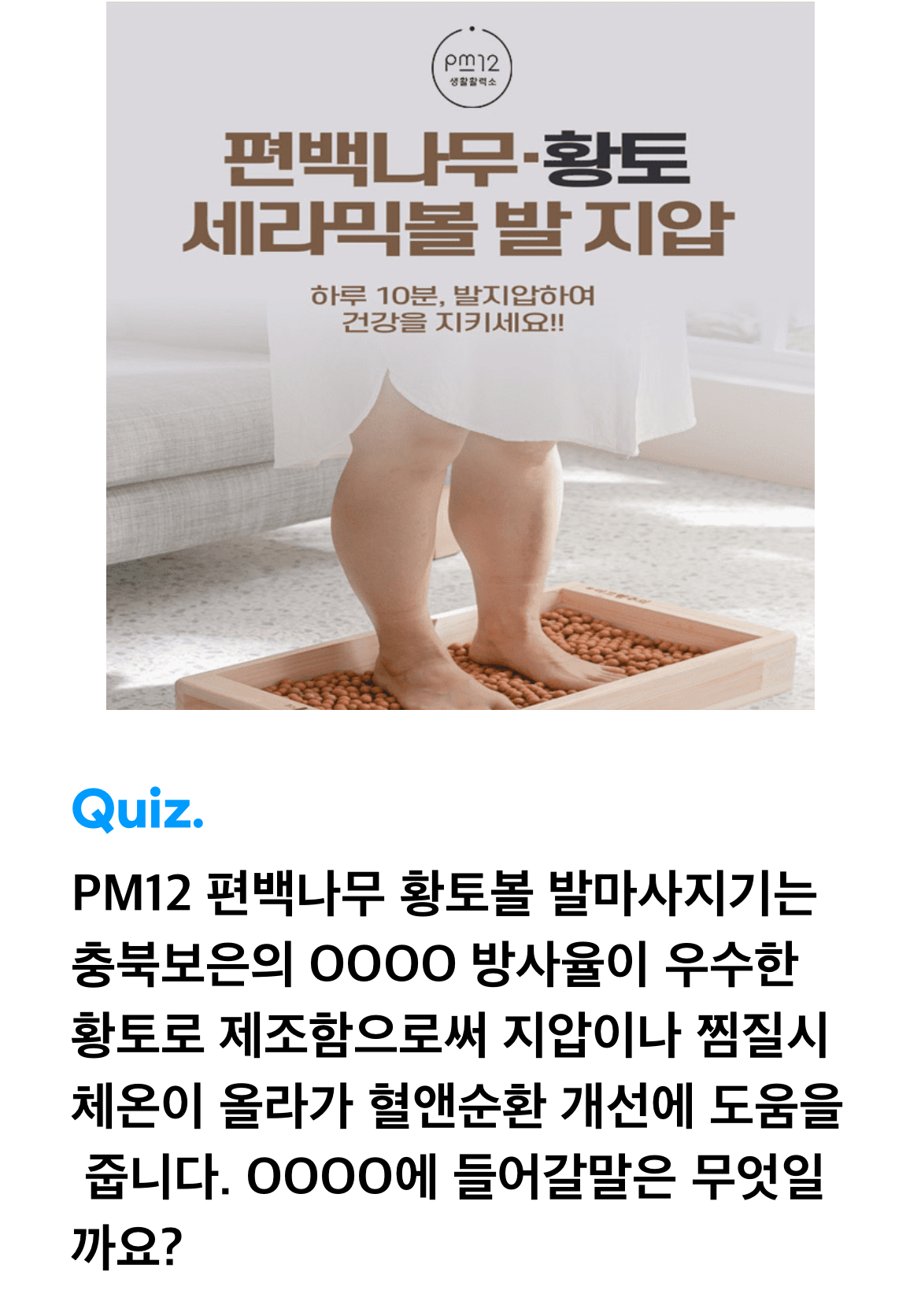 타임스프레드 용돈퀴즈 정답 PM12 편백나무 황토볼 발마사지기 방사율