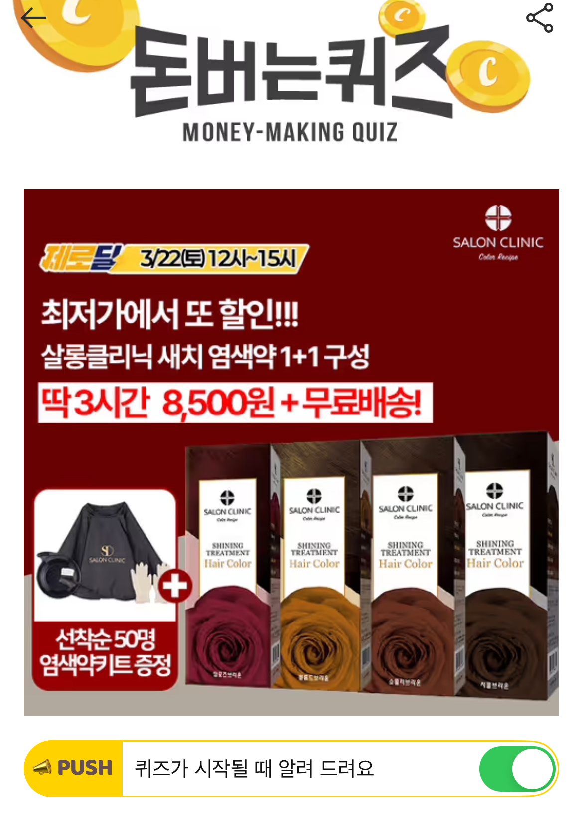 캐시워크 돈버는퀴즈 정답 캐시딜 타임특가 살롱클리닉 새 치염색약 1+1 ㅅㅋㄹ
