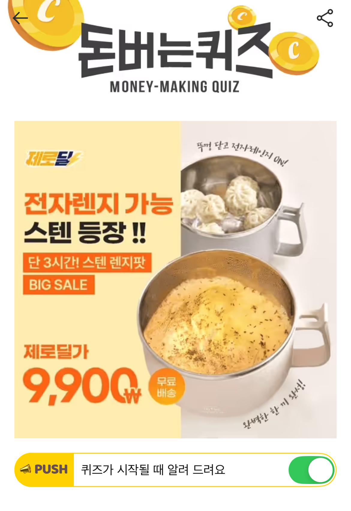 캐시워크 돈버는퀴즈 정답 캐시딜 타임특가 DIYOU 스텐렌지팟 OOOO원+무료배송