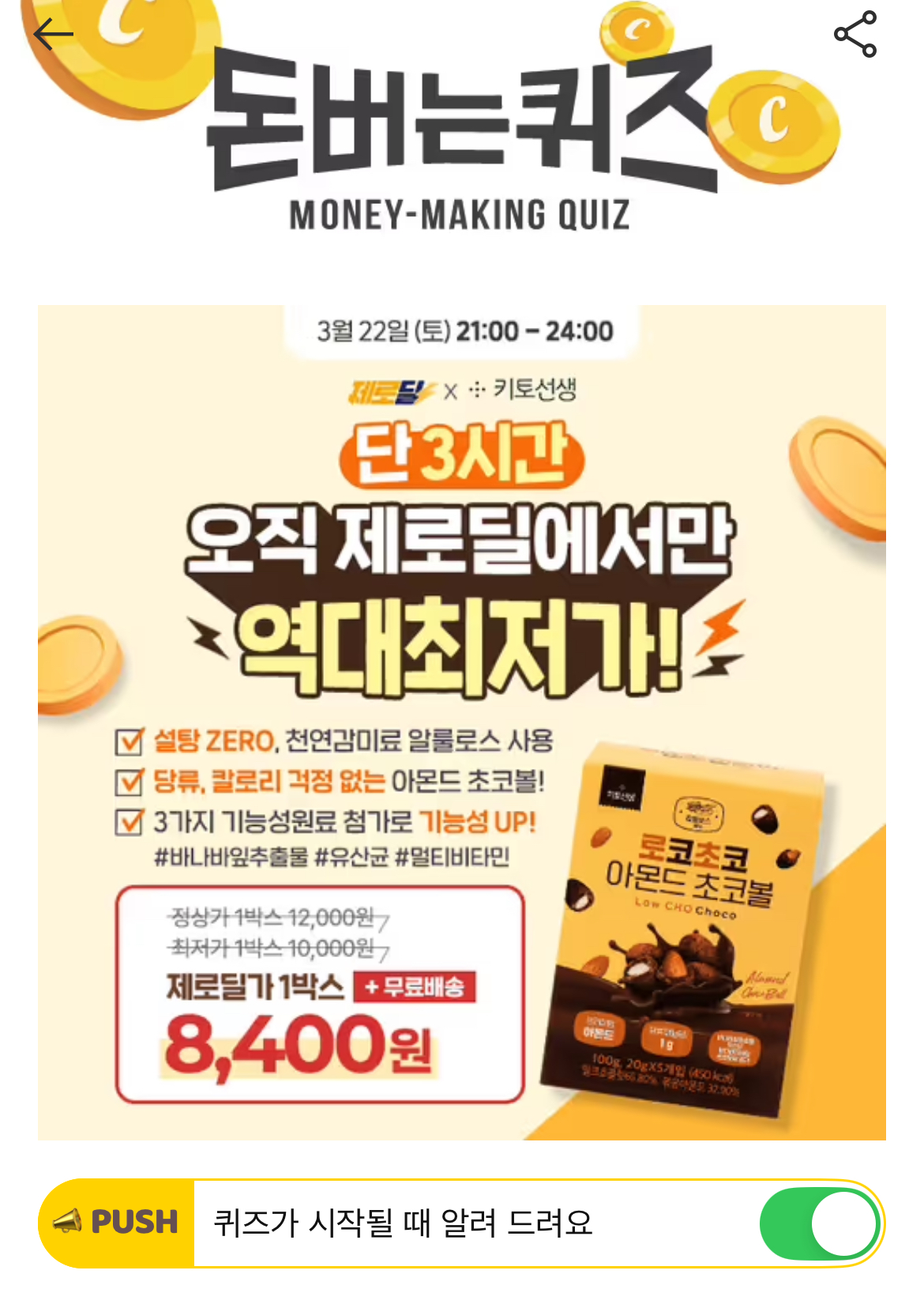 캐시워크 돈버는퀴즈 정답 로코초코 아몬드 초코볼 OOOOO 아몬드