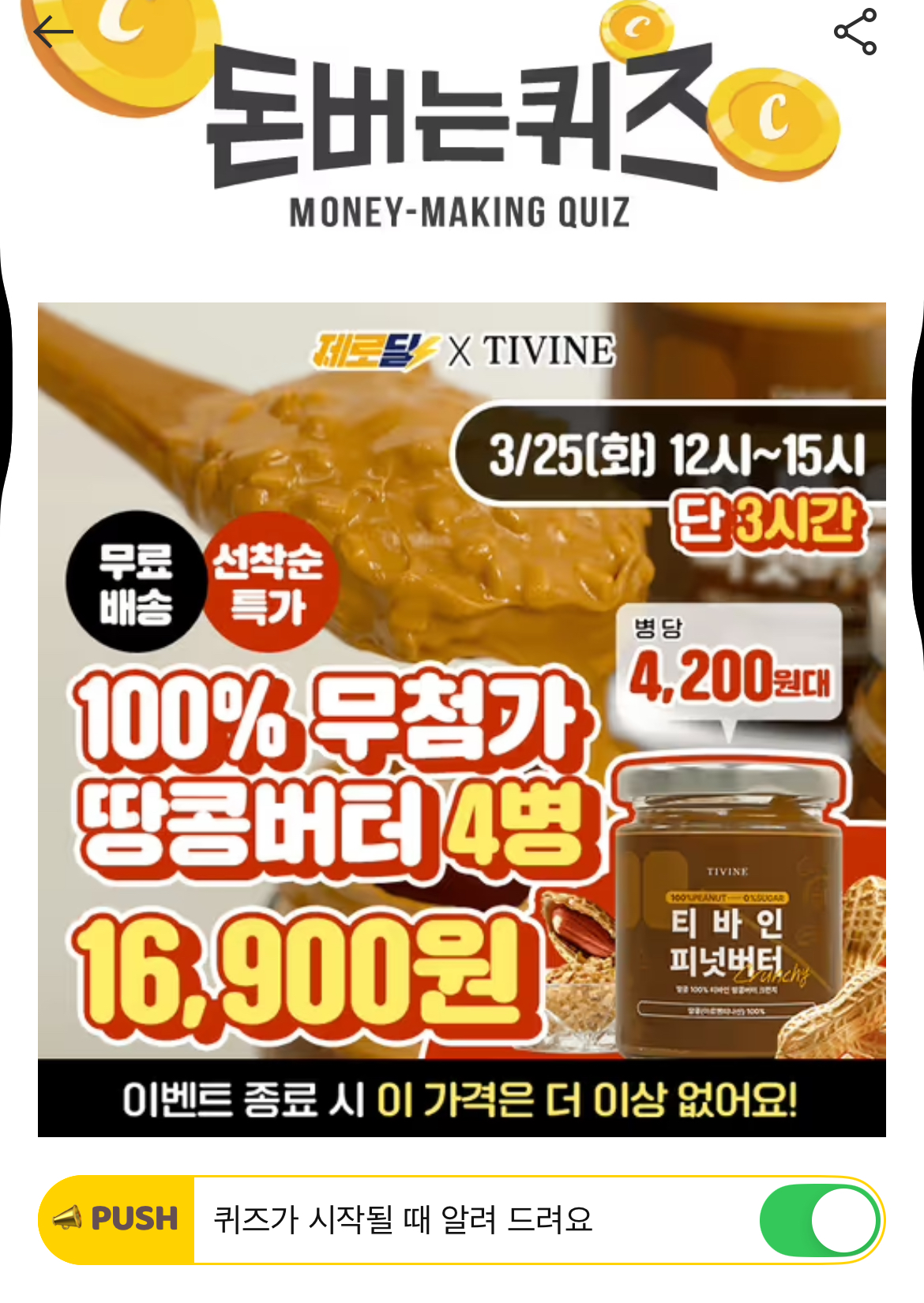 캐시워크 돈버는퀴즈 정답 캐시딜 타임특가 3+1 피넛 버터 OOOOO원 + 무료배송