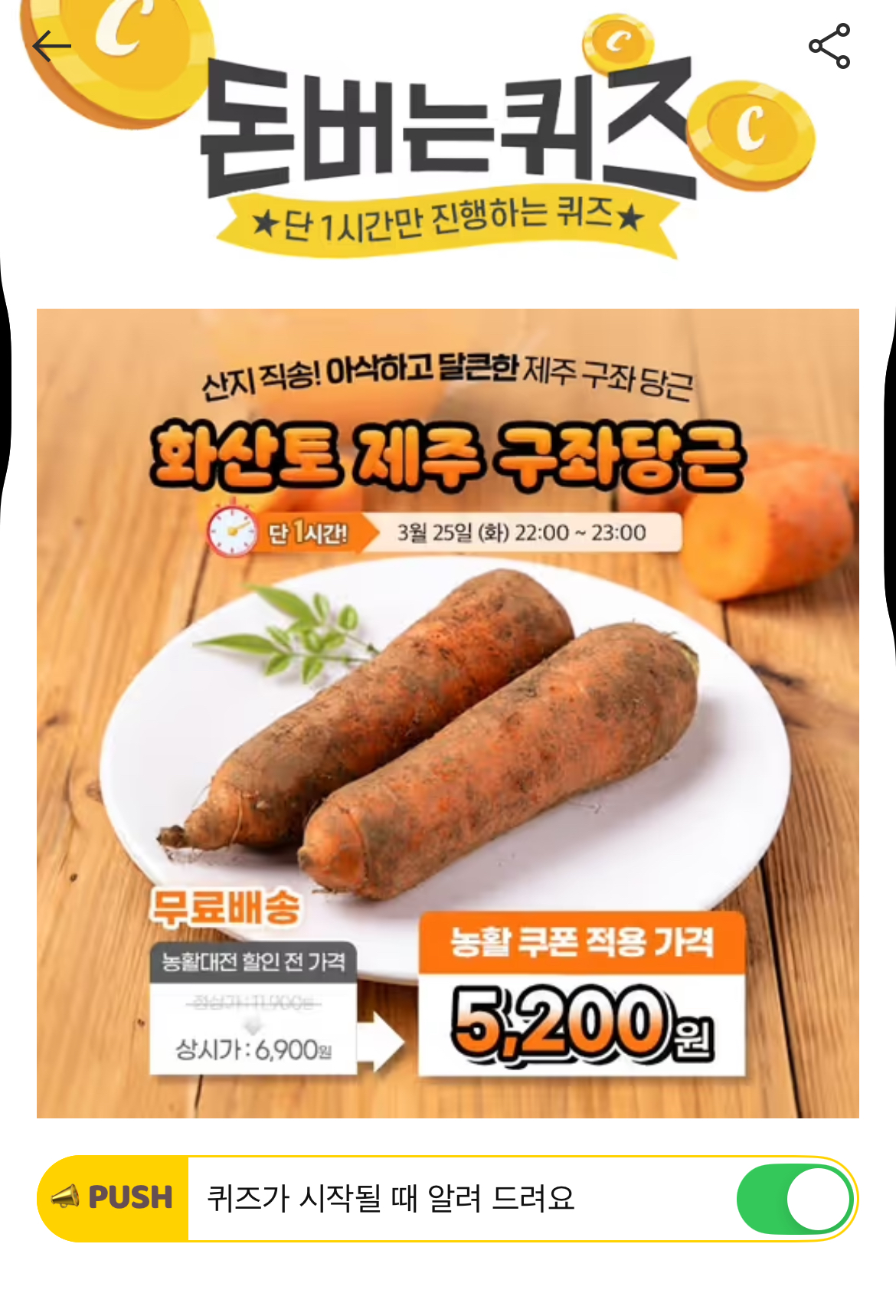 캐시워크 돈버는퀴즈 정답 캐시딜 제주 햇 구자당근 OOOO원+무료배송