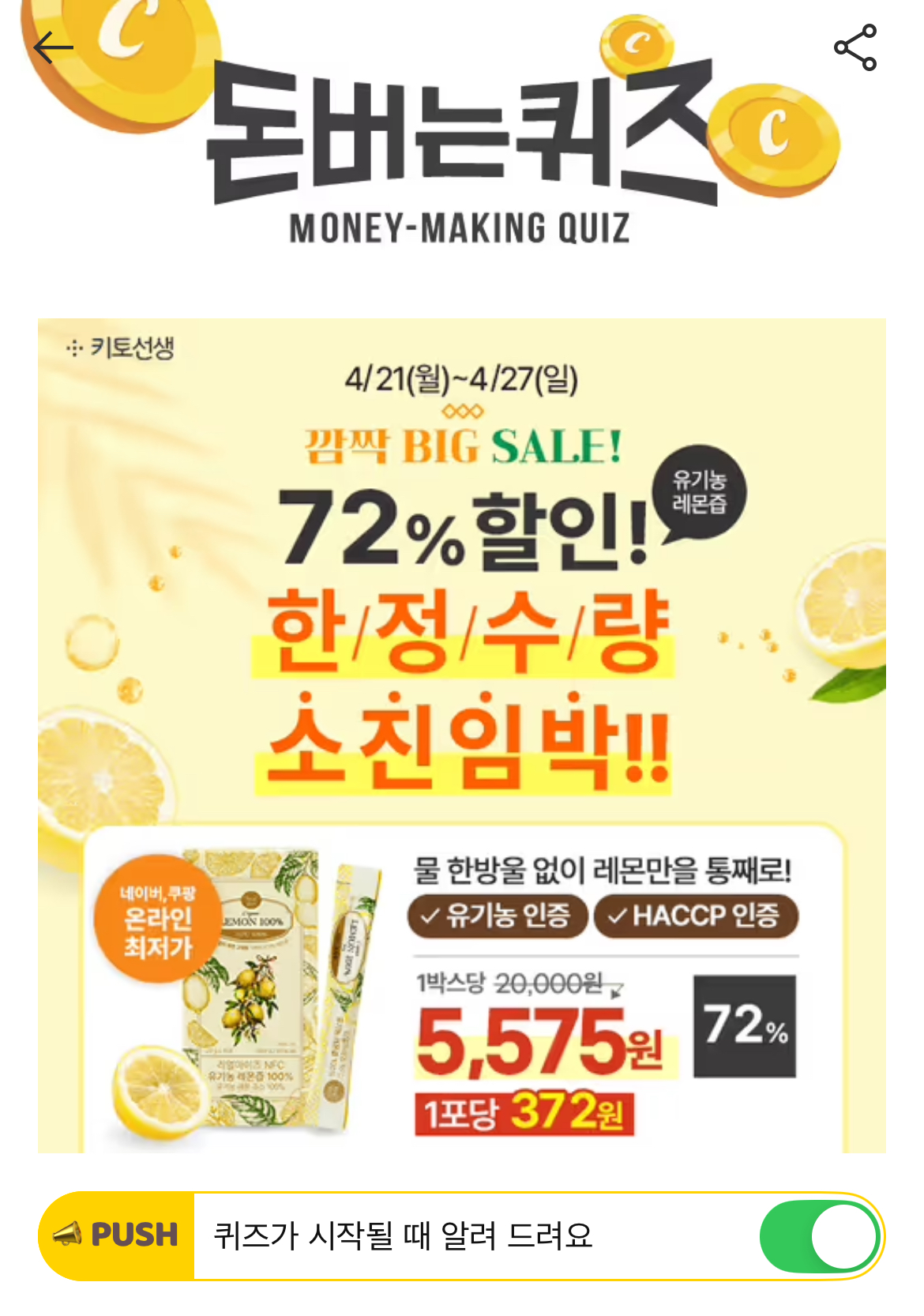 캐시워크 돈버는퀴즈 정답 리얼마이즈 유기농 레몬즙