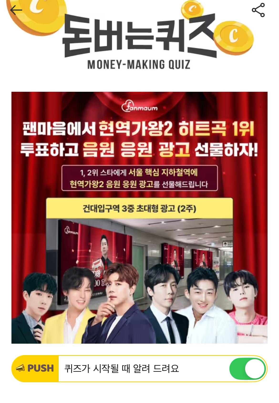 캐시워크 돈버는퀴즈 정답 팬마음 OOOOO 히트곡 / OOOO 광고