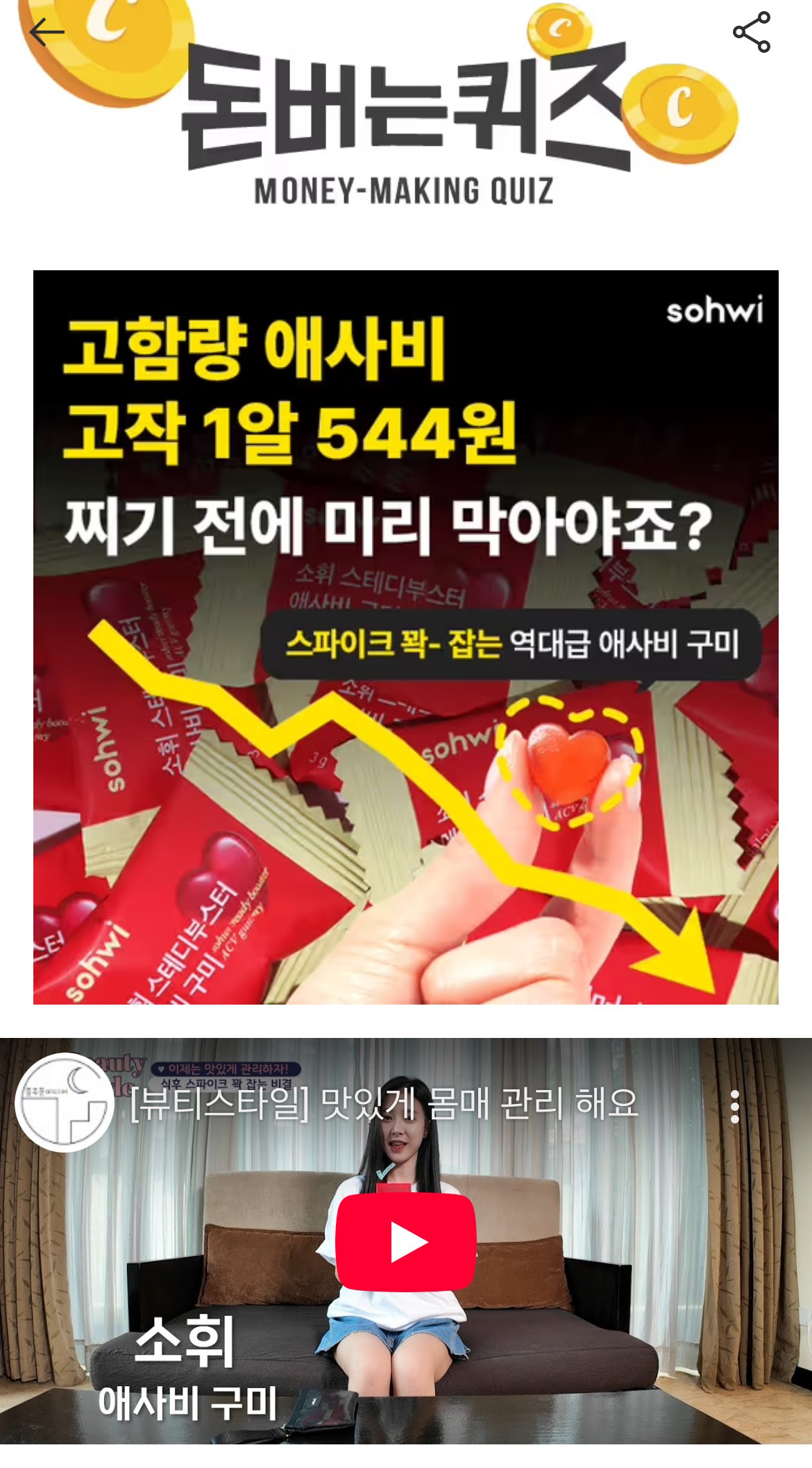 역대급 애사비 한샷 1구미에 꽉- 스파이크 꽉 잡는 입막템 구미 고민하면 품절돼요 이 구미 한알이 지금 먹고 계신 그 시큼쿰쿰 맛없는 애사비보다 함량 더 높아요. 그냥 젤리보다 맛있는 <소휘 애사비 구미> 역대급 함량! 살찌는 설탕폭탄 군것질 대신 당류1g 애사비 구미로 OO 못참는 가장 큰 원인 스파이크 확실하게 도와드려요. 여기서 OO은?