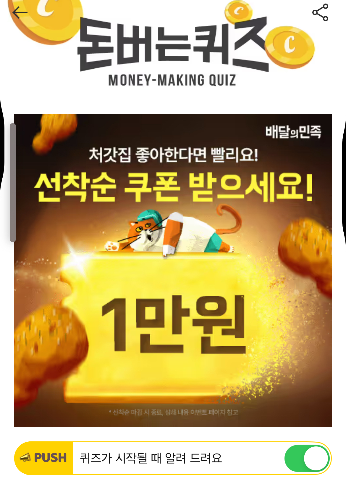 캐시워크 돈버는퀴즈 정답 배민 네네치킨 O천원 쿠폰