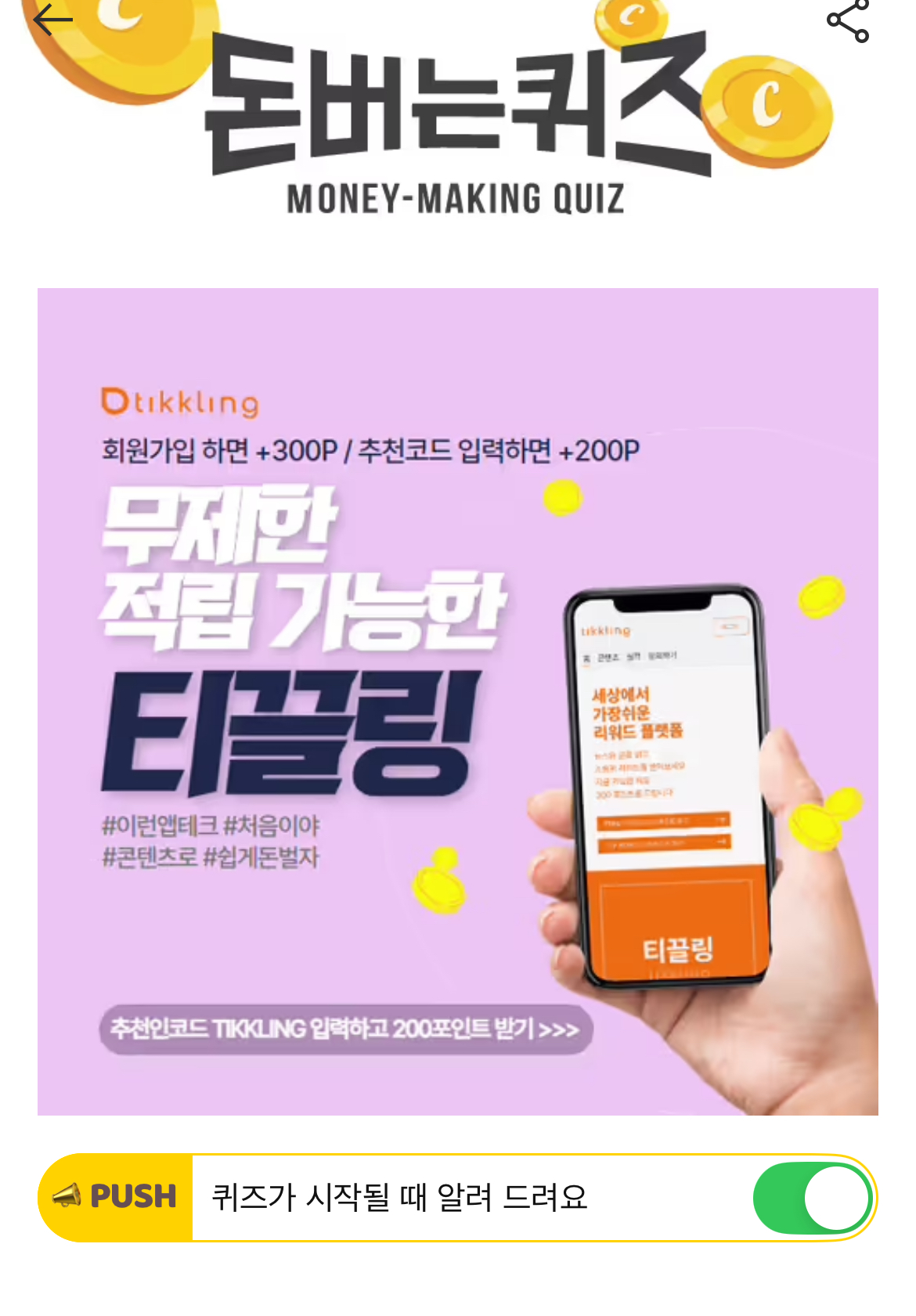 무제한 적립 가능한 앱테크 앱, 티끌링! 뉴스와 OOO을 읽기만 해도 포인트가 쌓여요. 무제한 적립한 포인트를 현금으로도 인출할 수 있어요. 지금 바로 회원가입하고 추천코드 작성하면 500포인트 100% 적립!
