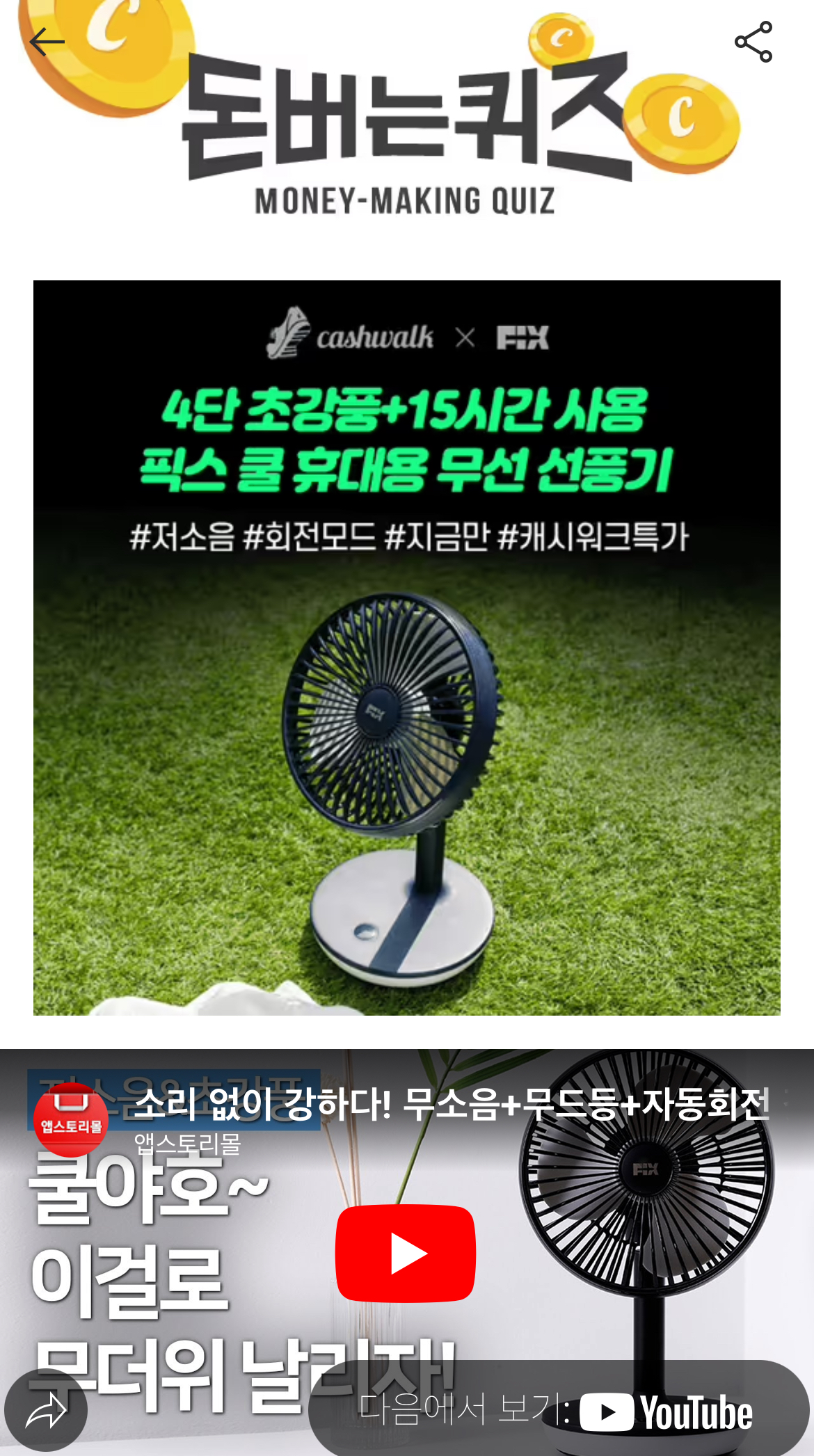 캐시워크 돈버는퀴즈 정답 픽스 쿨 휴대용 무선 선풍기 ㅈㄷㅎㅈ / OOOO 모터