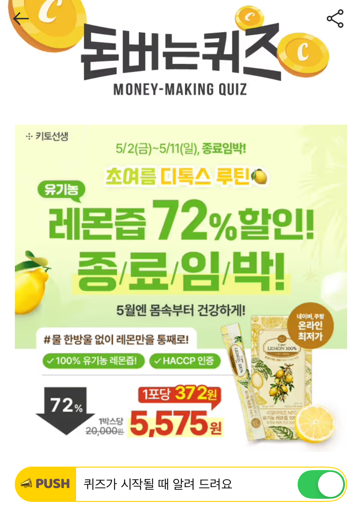 캐시워크 돈버는퀴즈 정답 리얼마이즈 유기농 레몬즙