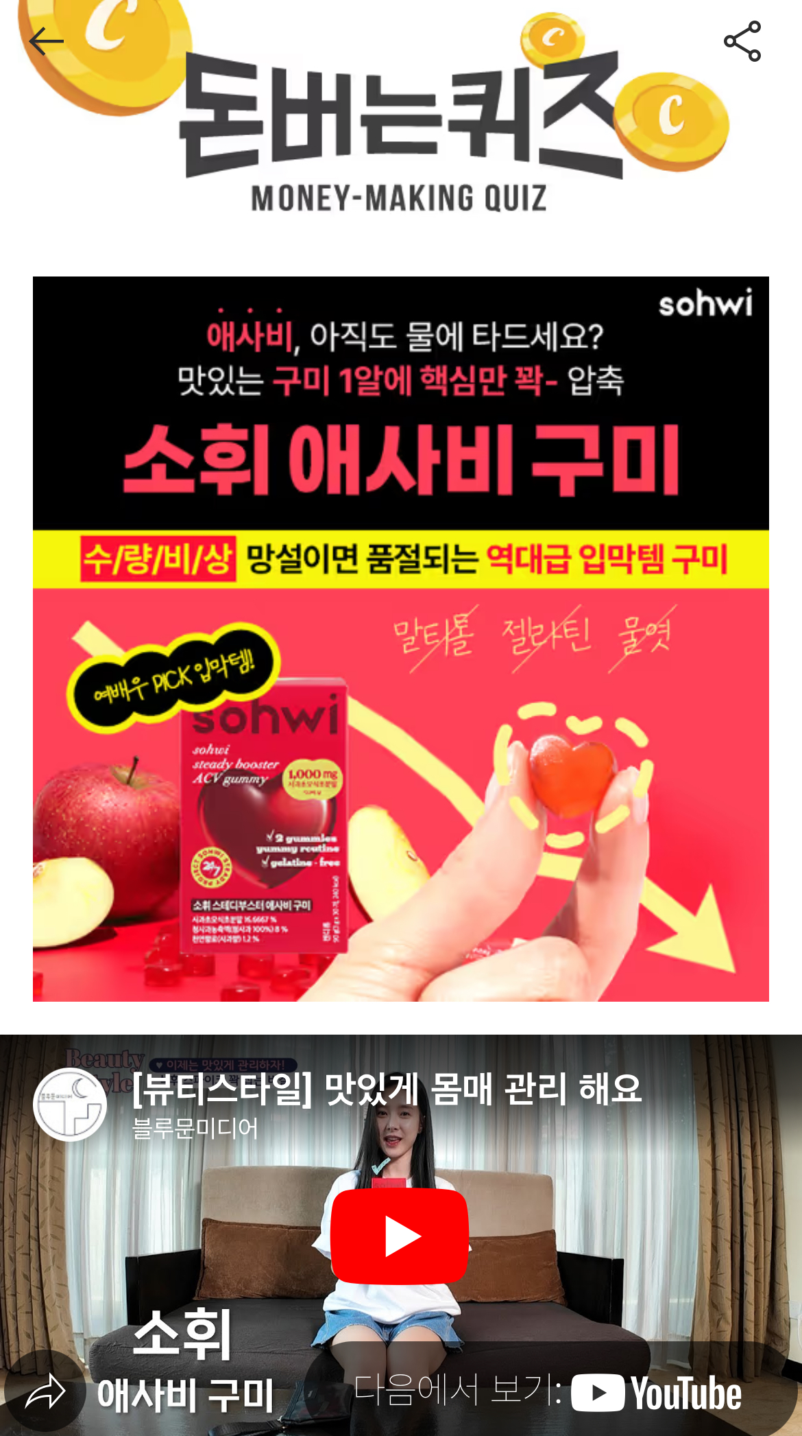 시큼쿰쿰 귀찮고 맛없는 애사비는 이제 그만! 구미 한 알로 식욕 폭주 원인 스파이크 딱 잡고, 물없이도 쏙! 간식처럼 맛있게 끝내요 수량비상 놓치면 품절될지 몰라요 상큼 쫄깃한 구미 1알에 핵심만 꽉 채운 소휘 애사비 구미는 말티톨, 젤라틴, OO 없이 유기농 애사비, 식이섬유를 꽉 채운 역대급 입막템 비건인증 구미 입니다. 여기서 OO은?