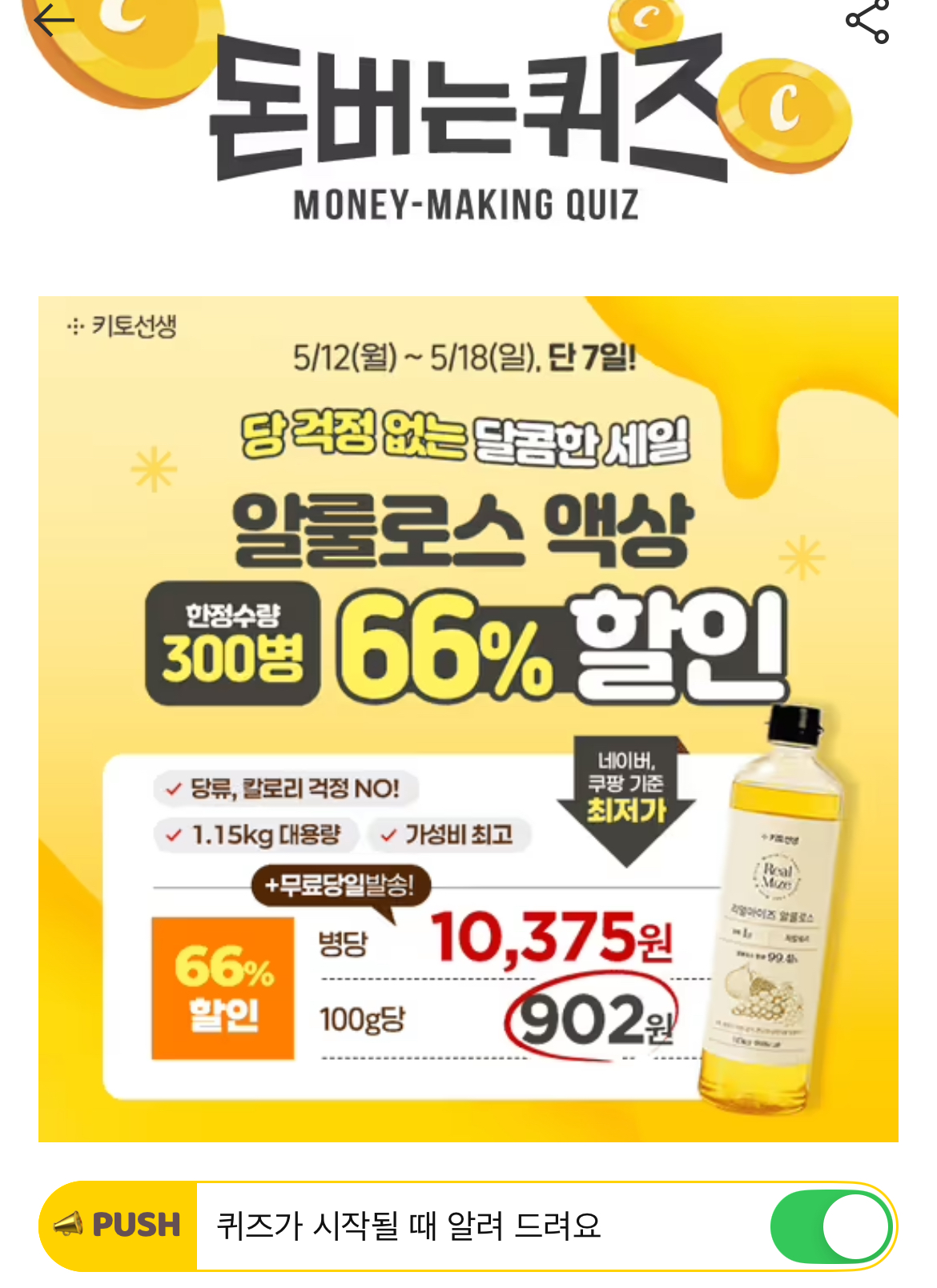 캐시워크 돈버는퀴즈 정답 리얼마이즈 알룰로스 액상