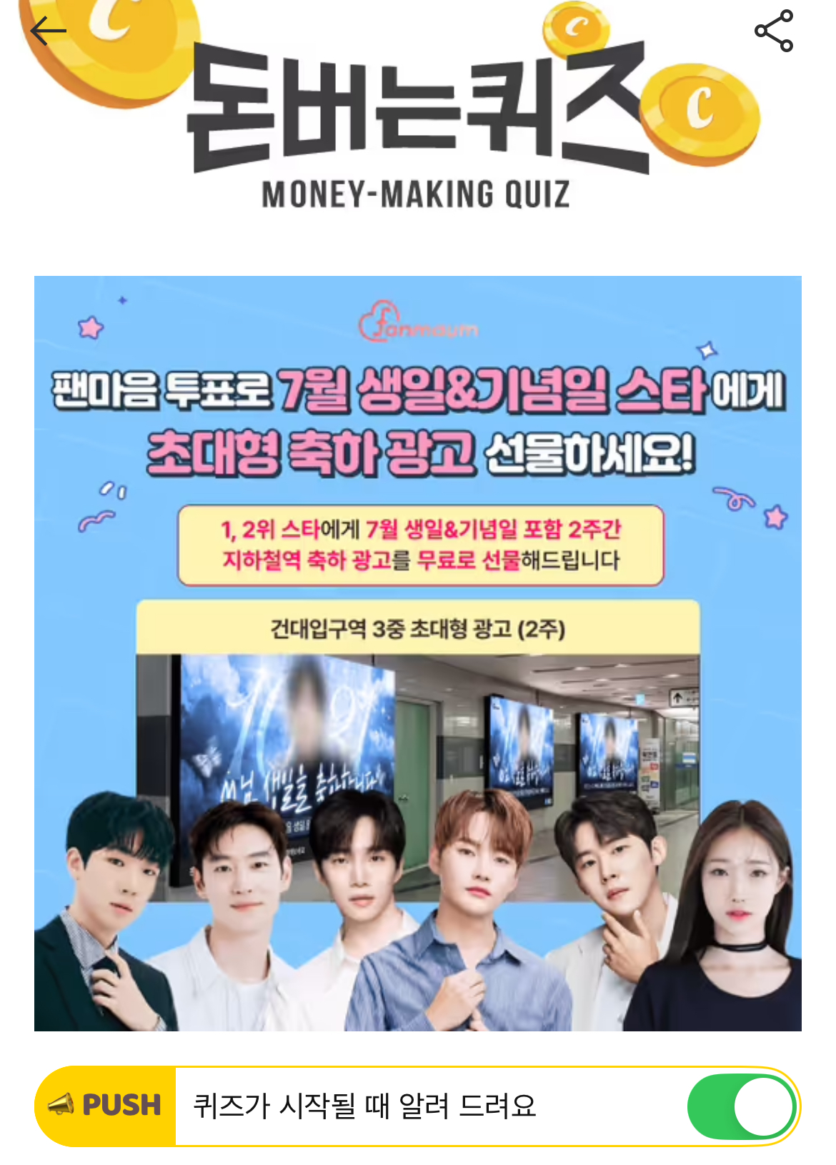 팬마음 행사 7월 생일&기념일 투표에서는 1위를 달성한 스타에게 유동 인구가 많은 OOOOO에 지하철역 초대형 축하 광고를 선물해 드려요.