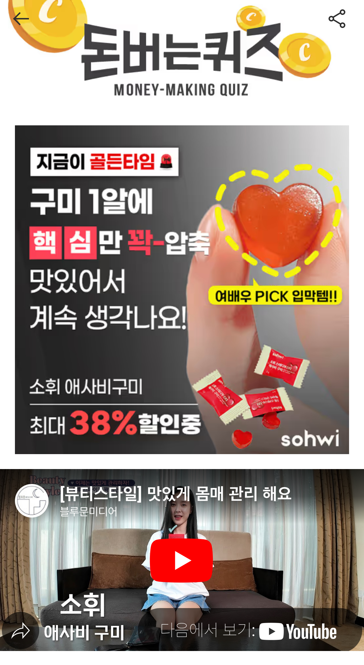 오늘도 폭발중인 식욕? 문제는 스파이크에요. 군것질 대신 새콤한 <소휘 애사비 구미>가 배고픔 컨트롤! 구미 1알에 핵심성분만 꽉-압축한 소휘 애사비구미는 말티톨, 물엿, 젤라틴이 무첨가 된 비건인증 구미입니다! 구미 1개당 "O"kcal, 당류 1g뿐인 진짜 저당 저칼로리 구미! 역대급 찐한 함량 쫄깃한 한알에 꽉! 여기서 O은? (힌트 : 숫자)