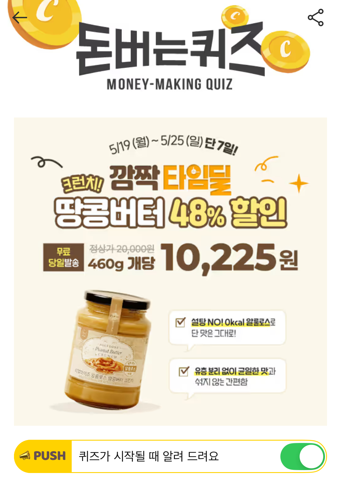 캐시워크 돈버는퀴즈 정답 리얼마이즈 알룰로스 땅콩버터 크런치
