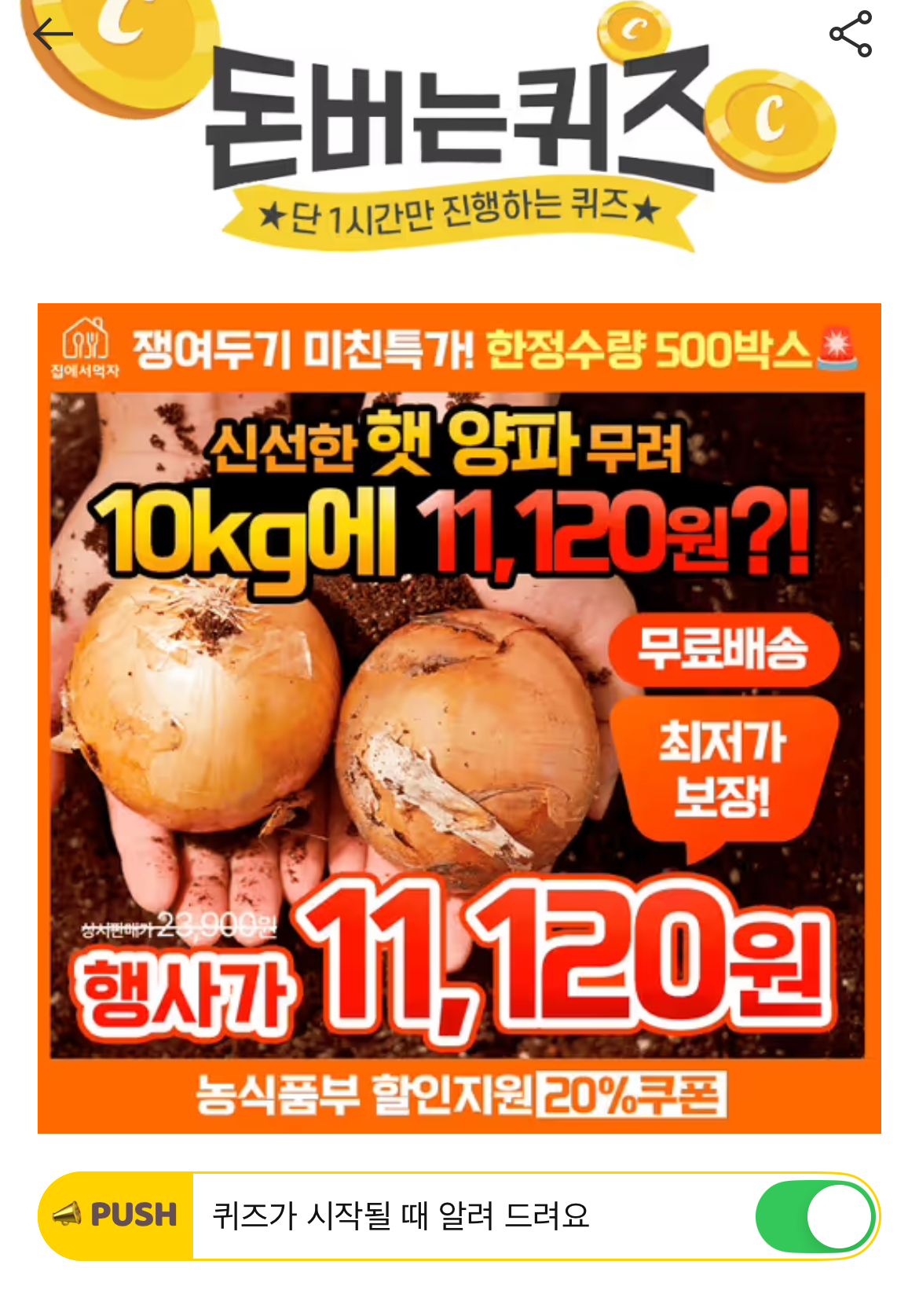 캐시워크 돈버는퀴즈 정답 캐시딜 타임특가 국내산 햇양파 10kg OOOOO원+무료배송