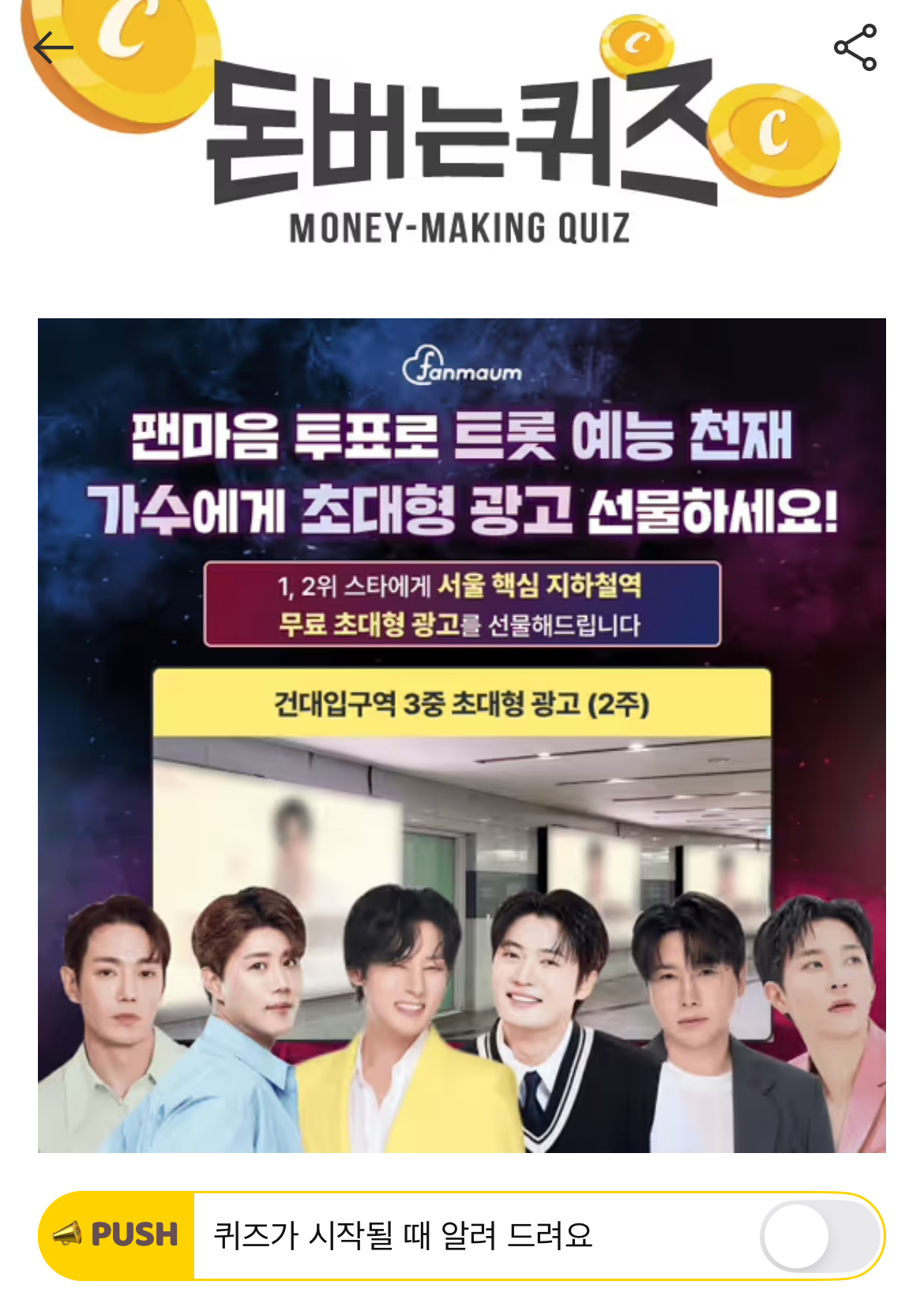 캐시워크 돈버는퀴즈 정답 팬마음 트롯 예능 천재 가수 투표