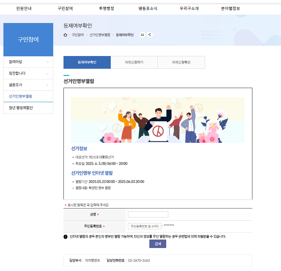 구,시,군, 청 홈페이지의 선거인명부열람페이지로 바로 연결됩니다.