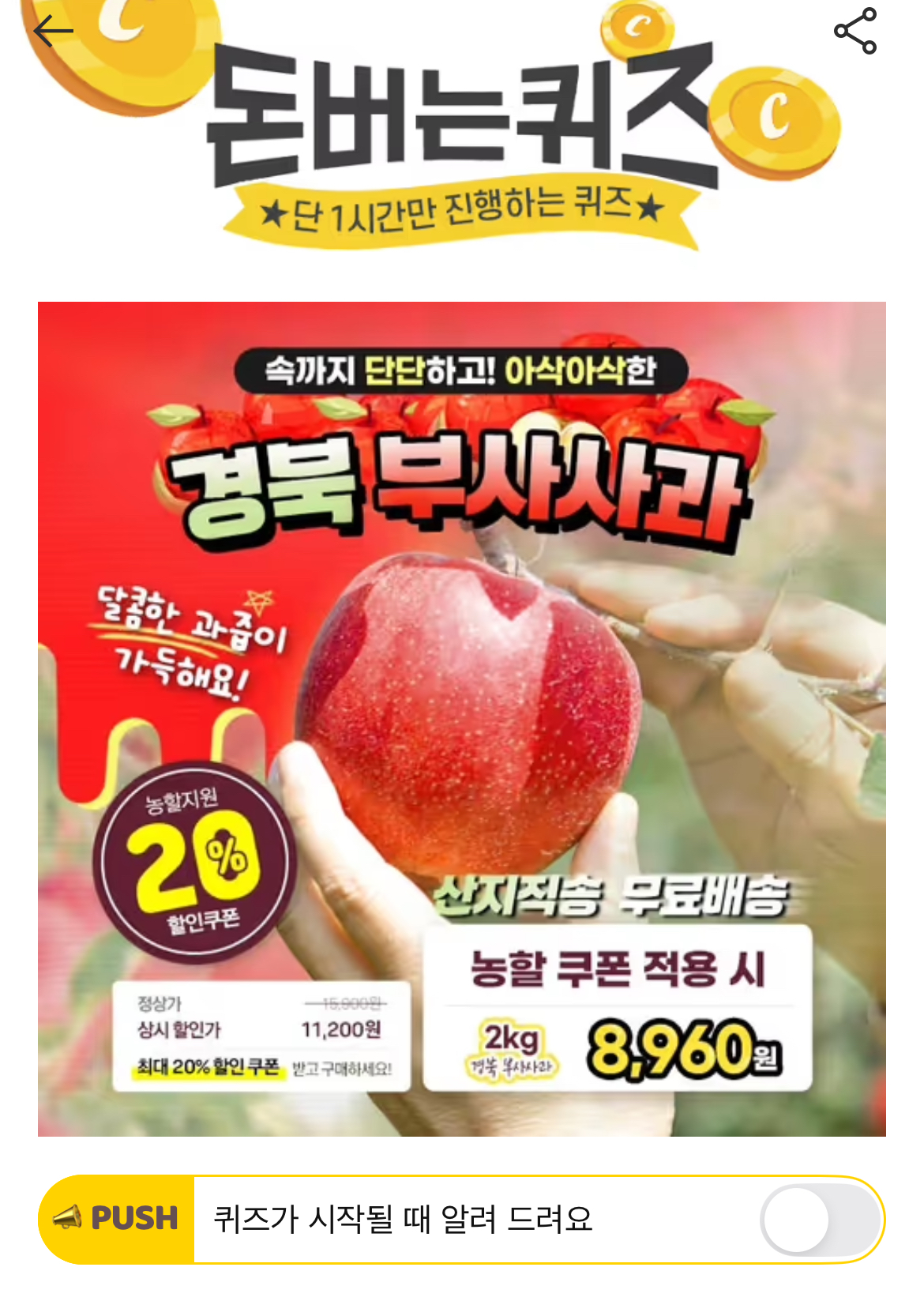 캐시워크 돈버는퀴즈 정답 캐시딜 신선하랑 경북 부사사과