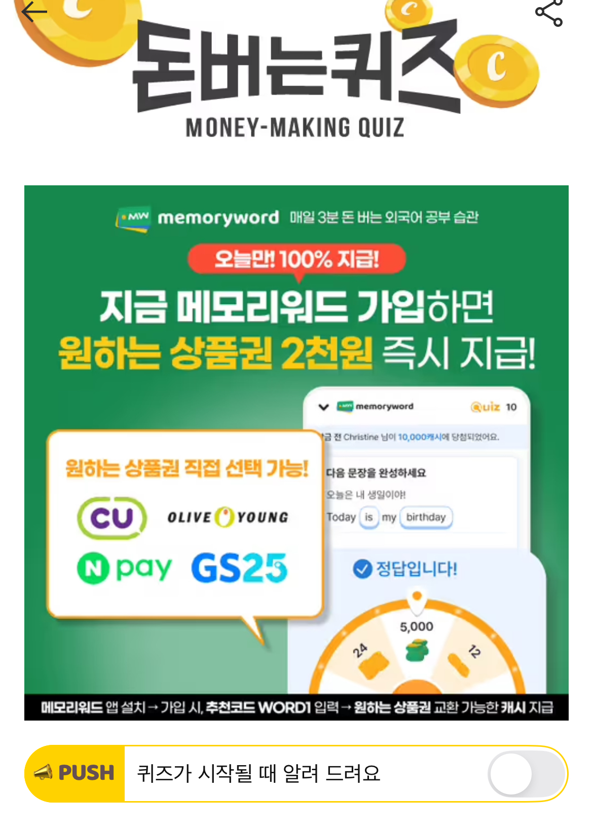 메모리워드에서 OOOO하며 돈 벌어 가세요! 지금 메모리워드에 가입하면 원하는 상품권으로 교환 가능한 캐시를 드립니다! 메모리워드에서는 영단어 퀴즈와 말하기 퀴즈를 통해 즐겁게 OOOO를 할 수 있어요. 매일 3분 메모리워드에서 OOOO하고 영어 실력과 공부 습관을 만들어 보세요!