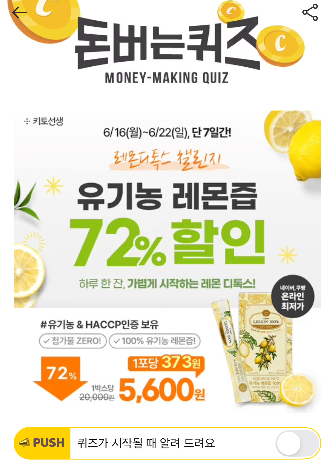 캐시워크 돈버는퀴즈 정답 리얼마이즈 유기농 레몬즙