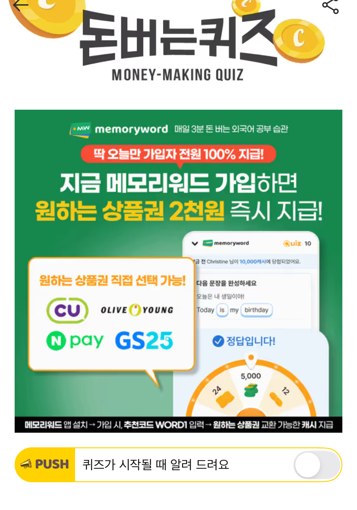 매일 영어 공부하며 돈 버는 영단어 앱 메모리워드는 OO OO 1개만 풀어도 편의점, 카페 등 다양한 상품권으로 교환할 수 있는 캐시가 적립돼요! 지금 바로 메모리워드 앱 설치하고 가입만 해도 원하는 상품권으로 즉시 교환 가능한 캐시를 드립니다! 메모리워드로 OO OO 풀며 재미있게 영어 공부하고, 돈도 벌어가세요!