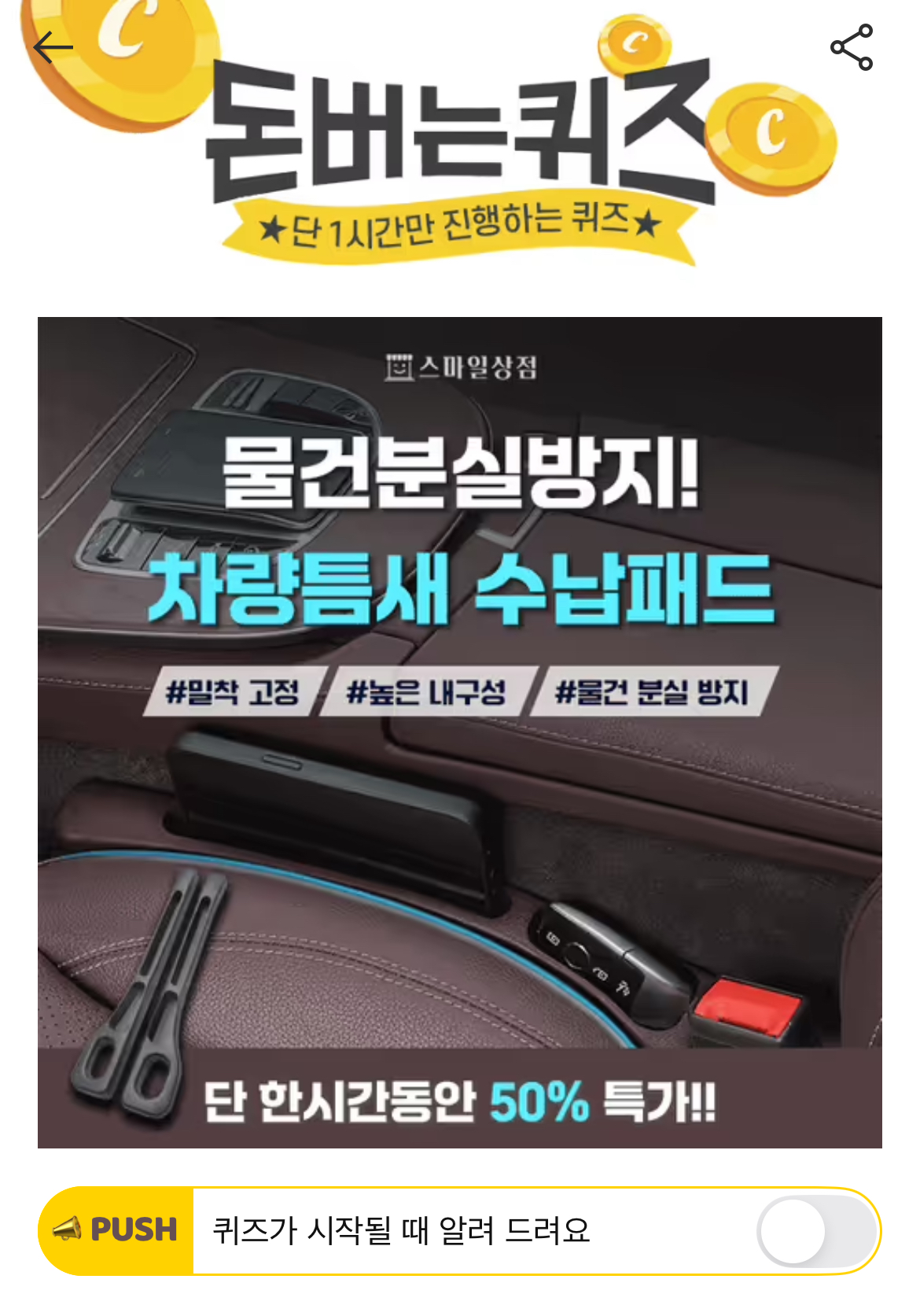 캐시워크 돈버는퀴즈 정답 스마일상점 차량틈새 수납패드