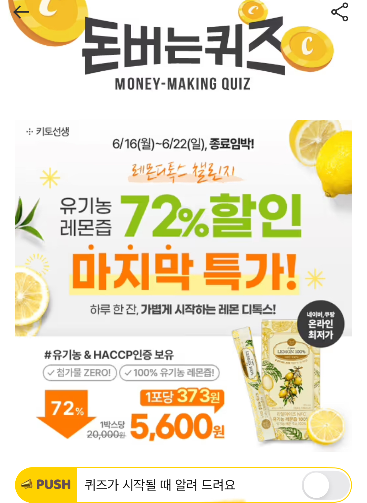 캐시워크 돈버는퀴즈 정답 리얼마이즈 유기농 레몬즙