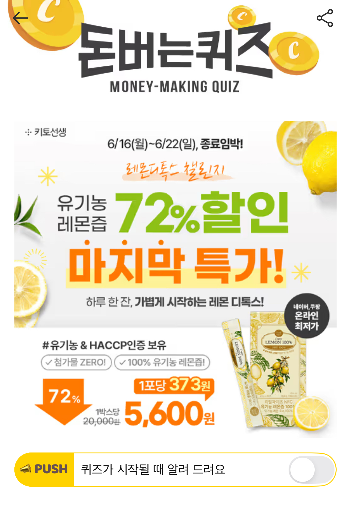 캐시워크 돈버는퀴즈 정답 리얼마이즈 유기농 레몬즙