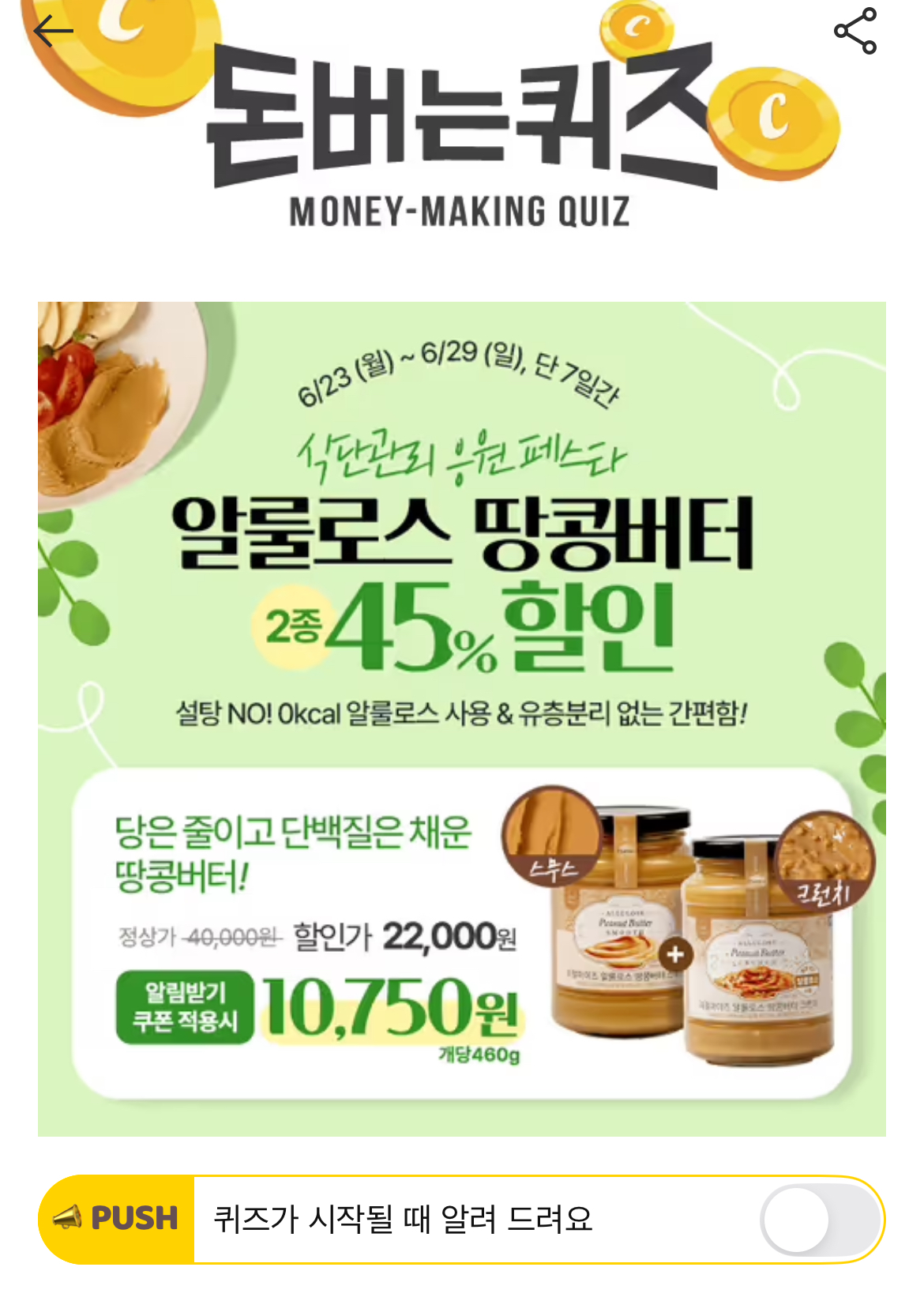 캐시워크 돈버는퀴즈 정답 리얼마이즈 알룰로스 땅콩버터