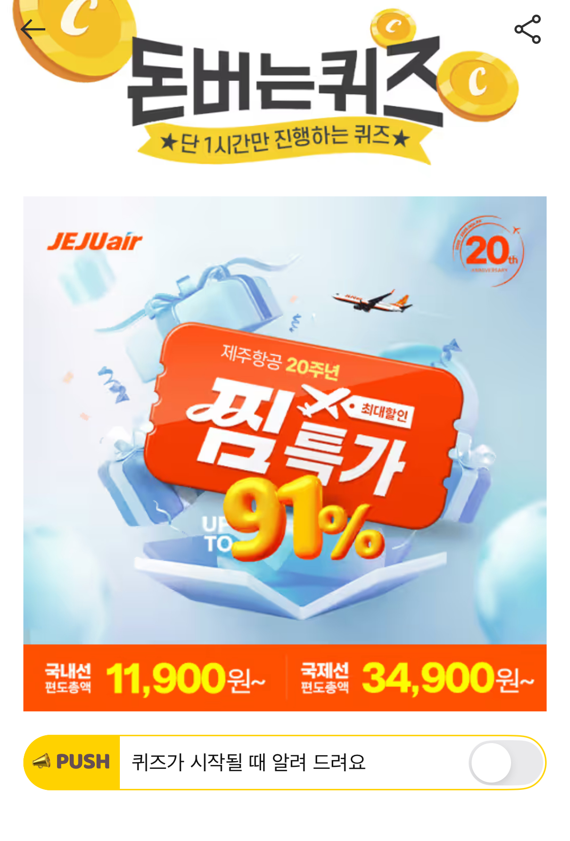 캐시워크 돈버는퀴즈 정답 제주항공 창립 20주년 기념 역대급 찜특가 선착순 OO명