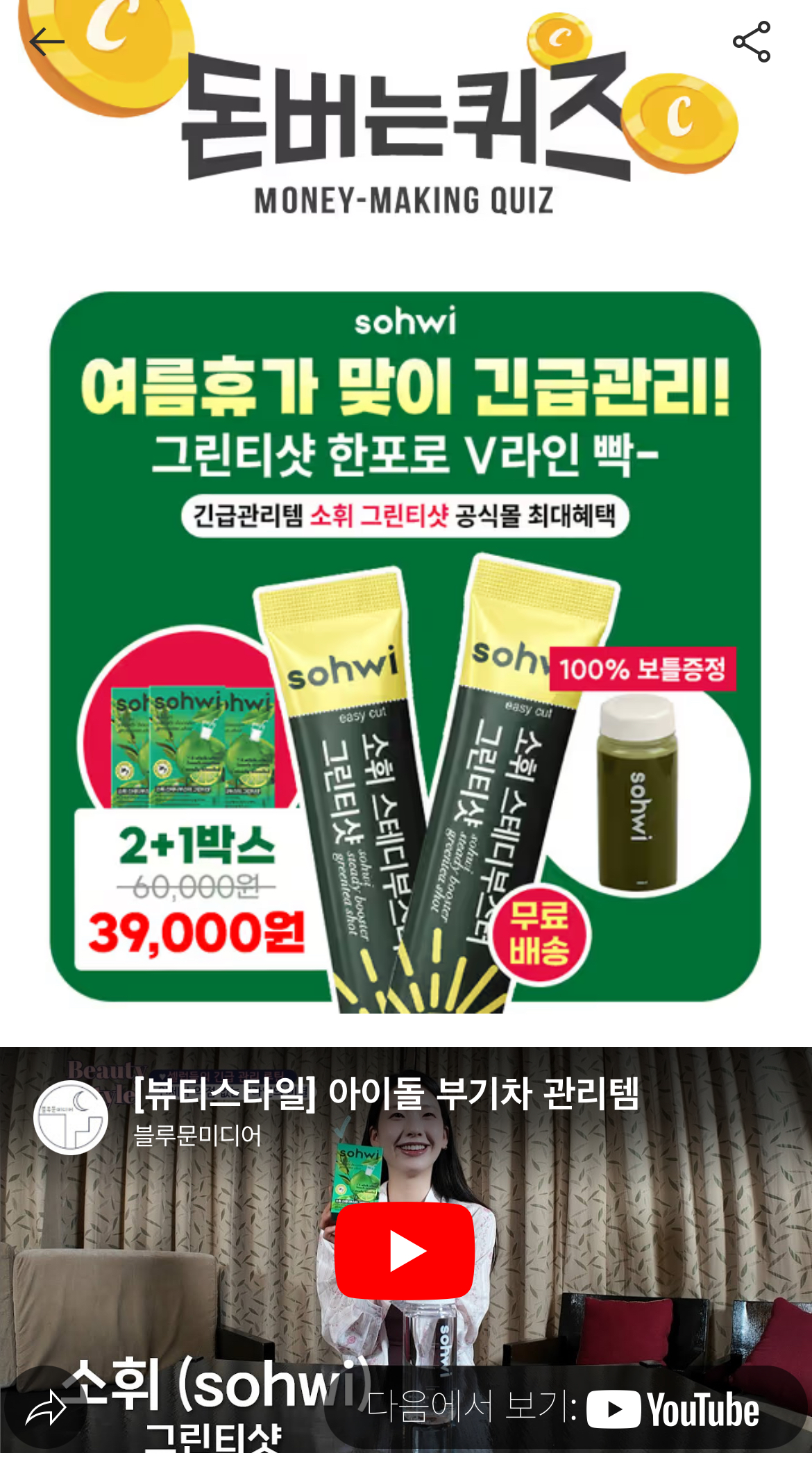 캐시워크 돈버는퀴즈 정답 소휘 그린티샷