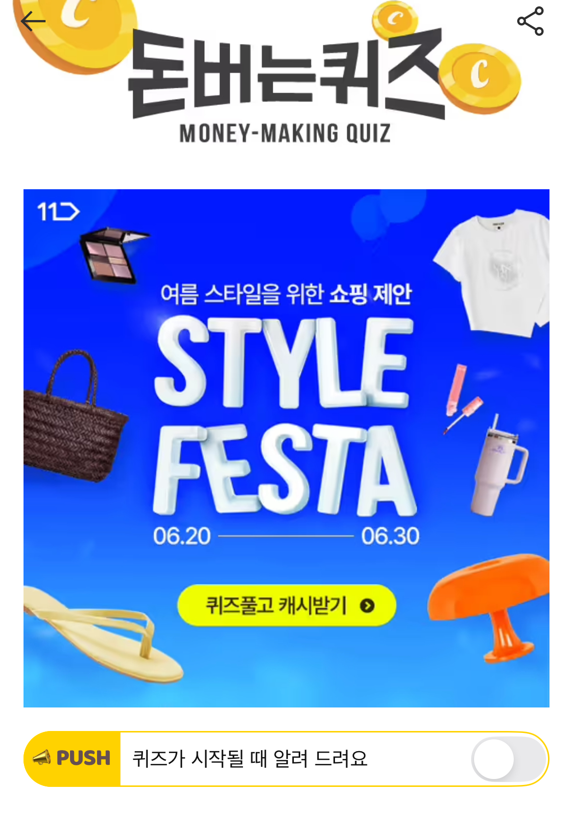 [6/20~6/30] 여름 스타일을 위한 쇼핑 제안, 11번가 OOOOOO! 역대급 론칭 혜택! OOOOOO에서 매일 리빙·패션·뷰티 선착순 3천원 쿠폰과 경품 응모까지! OOOOOO에 들어갈 단어는 무엇일까요? (초성 힌트: ㅅㅌㅇㅍㅅㅌ)