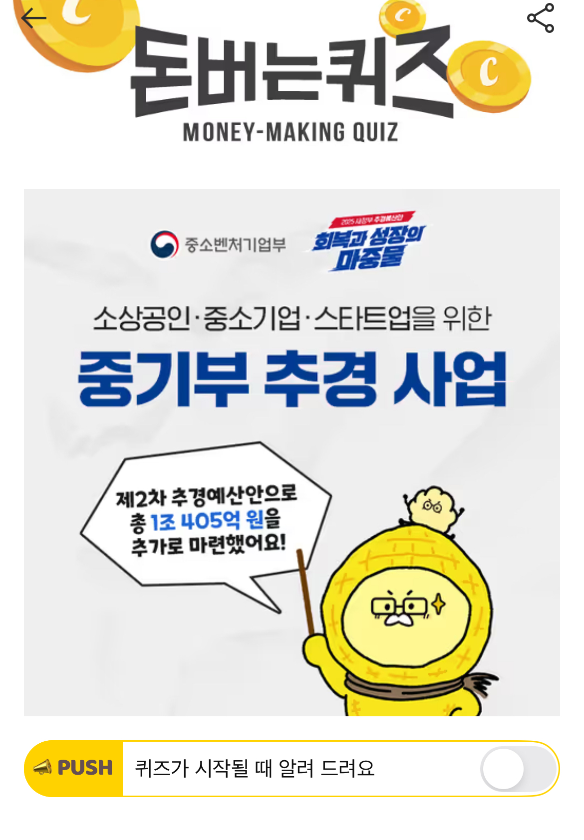 캐시워크 돈버는퀴즈 정답 중소벤처기업부 추경 사업 숫자 / ㅊㅇㅍㅋㅈ